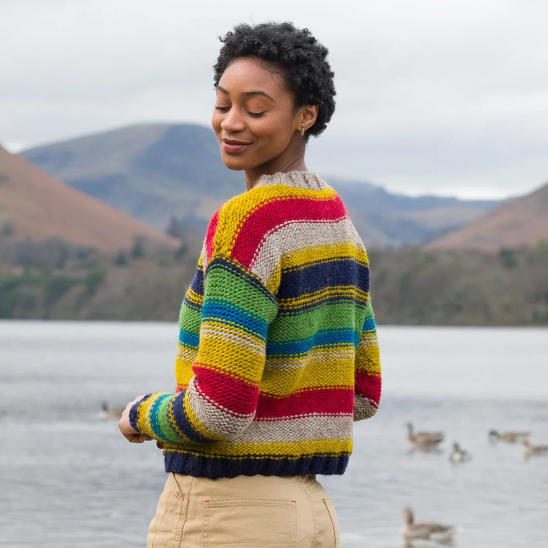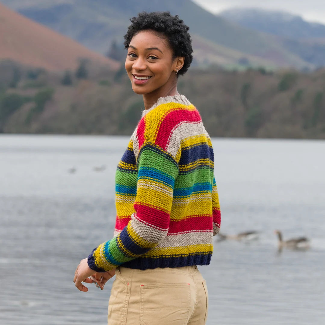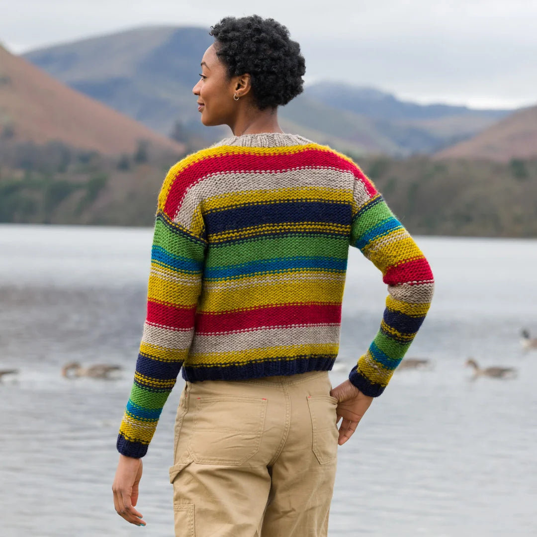 This stylish drop shoulder sweater, designed in all three &Make yarns, is the ultimate striped sweater. The contemporary striped sections vary in width, and rows of garter stitch mark the color changes, making a clever modern twist on old classic striped designs.