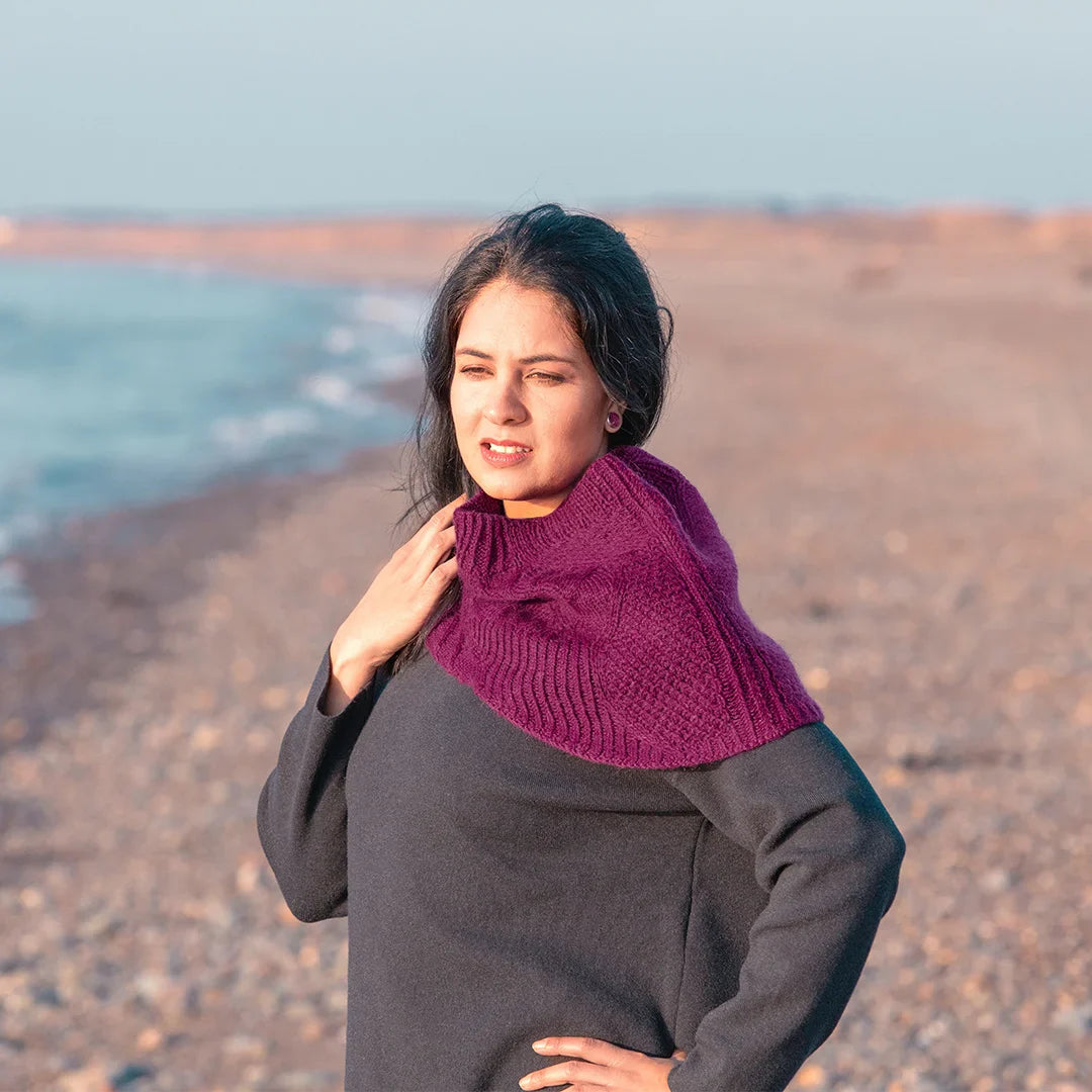 Anadrom Cowl is knit in Cumbria, a worsted-weight yarn blend of Masham wool, Merino and mohair. The resulting fabric is soft yet sturdy, with an incredible stitch definition that makes this cowl’s all-over texture vividly stand out.