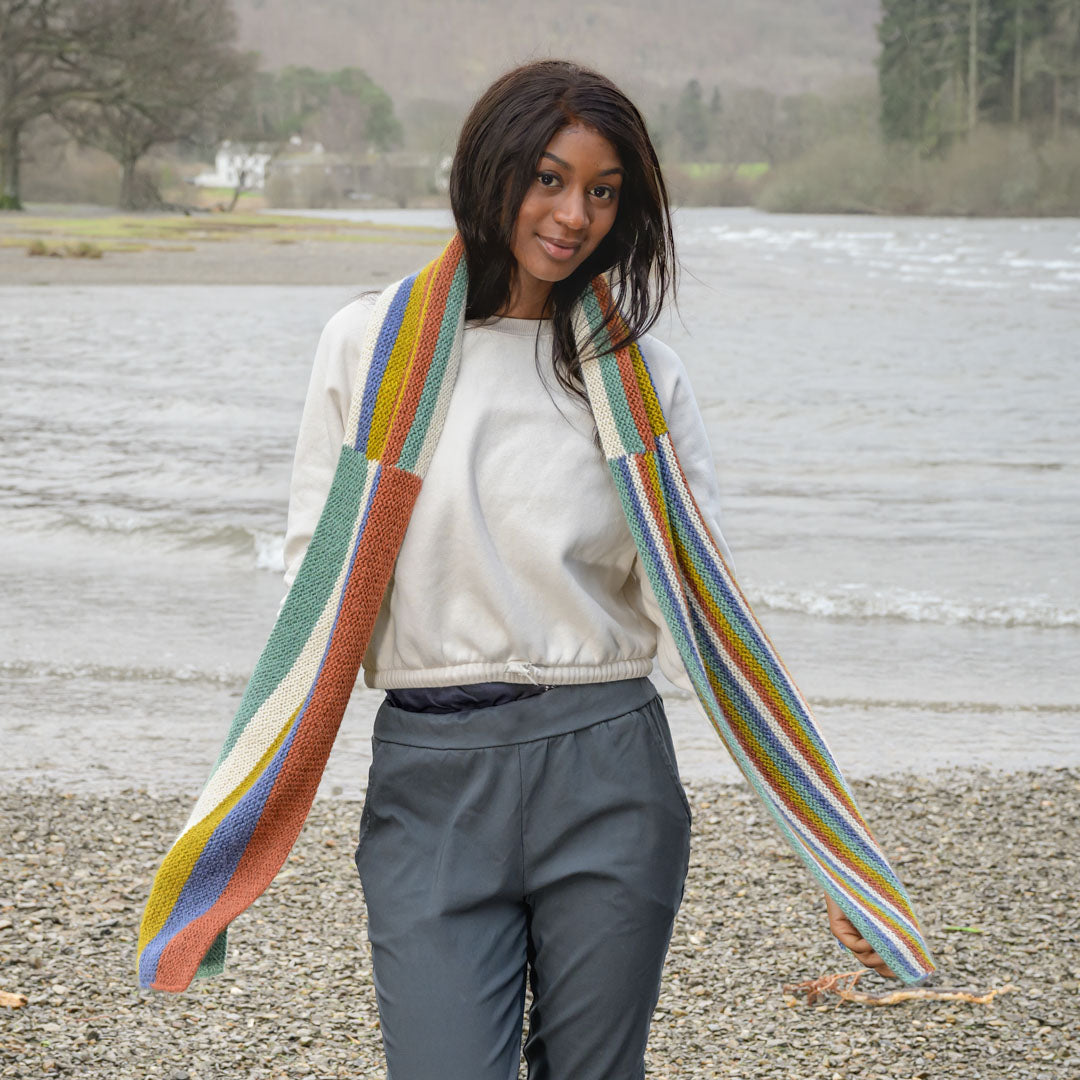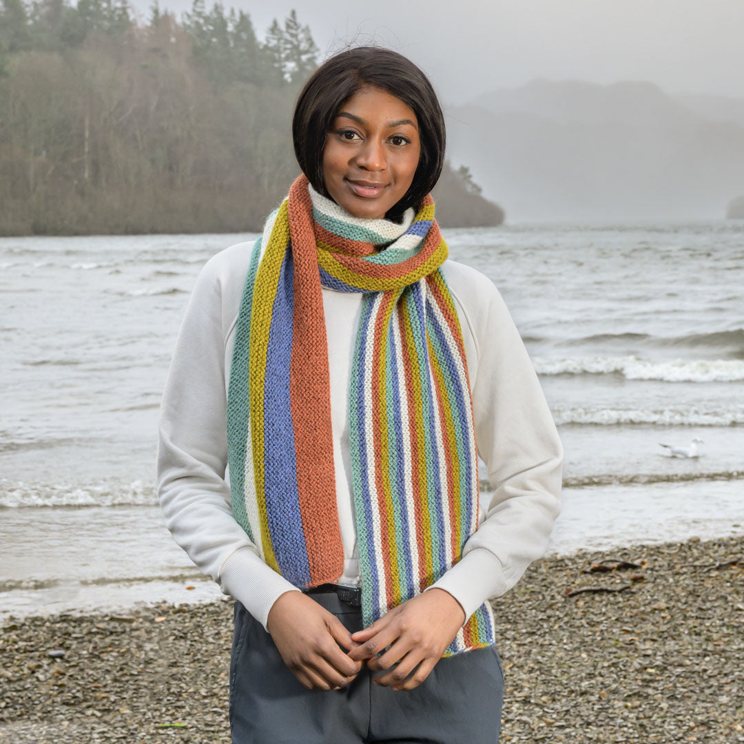 With a generous size and cushy garter stitch, the BandWidth Scarf is made with three separate panels that are sewn together so the stripes flow in a vertical direction when worn.
