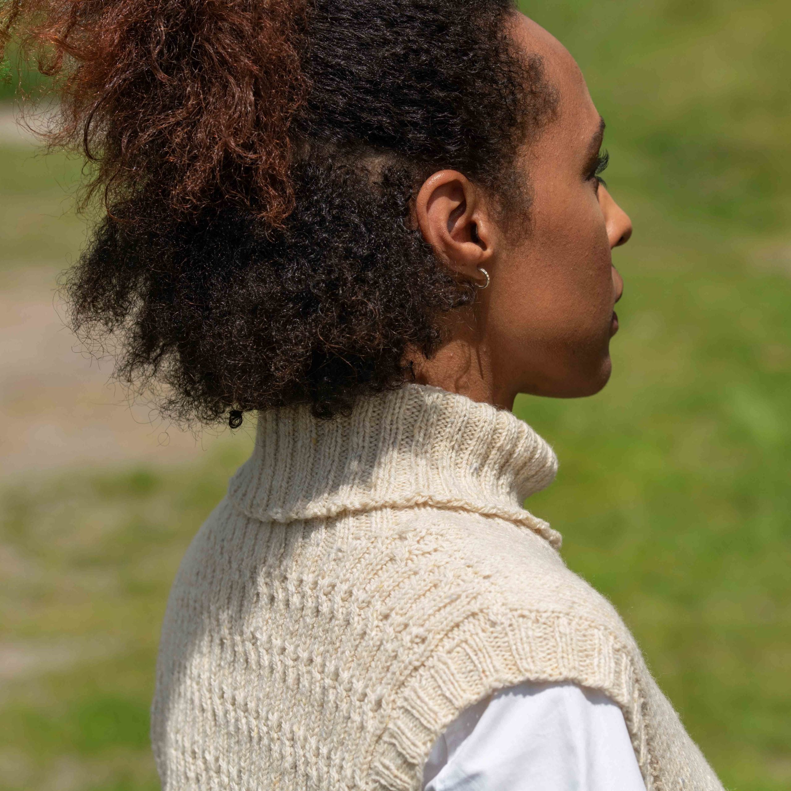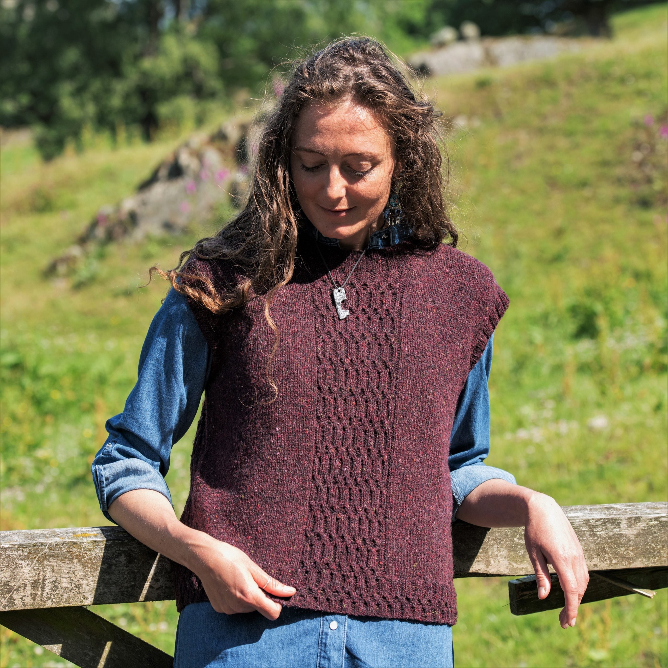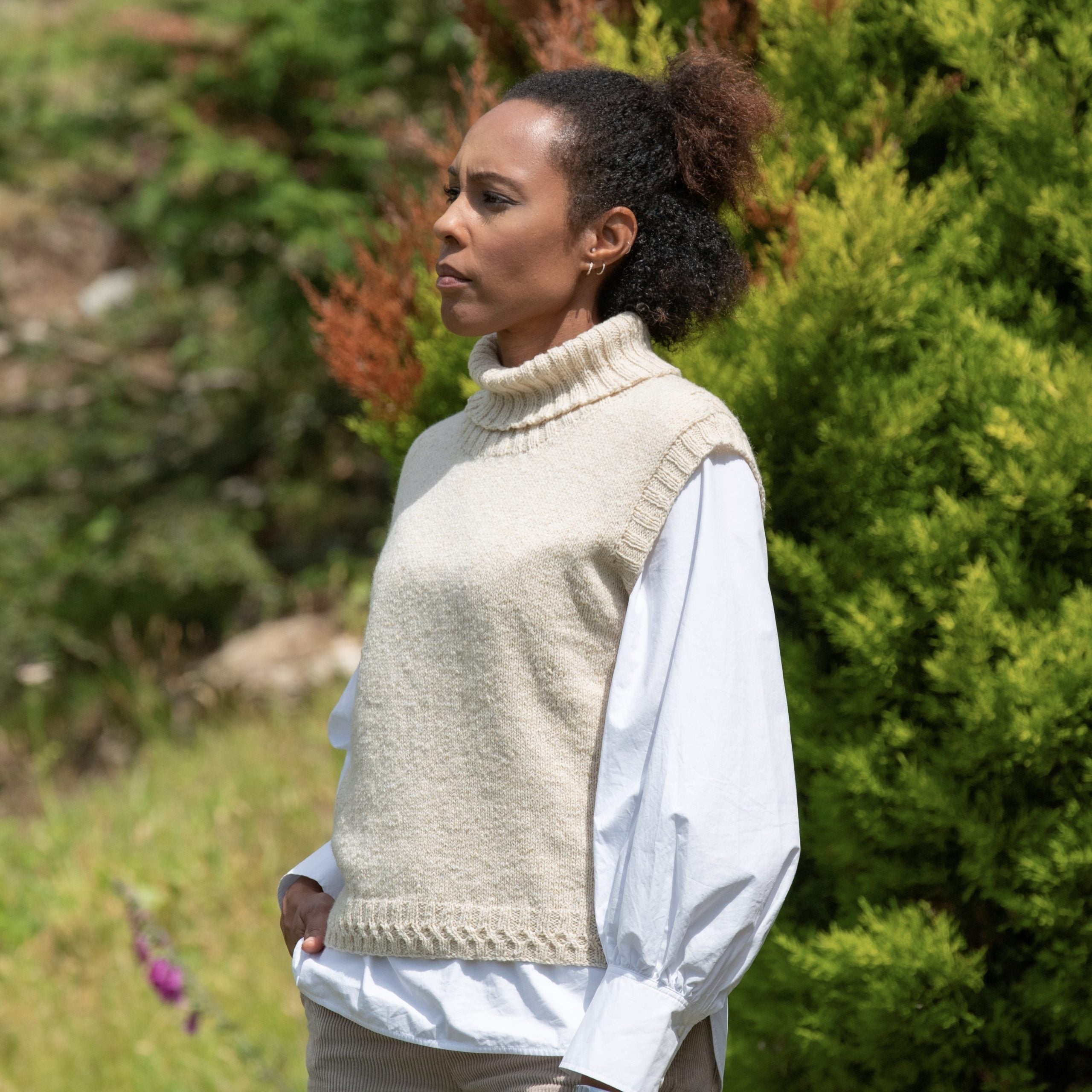Cherry Bark is a classic slipover knit in our wonderfully full yarn Arranmore Light. The design features a textured stitch pattern across the back and comes with two neck options. The first option is a roll neck with a plain stocking stitch front, shown in this pattern in shade St. Claire and the second option is a wide crew neck with a front texture panel shown in shade Brannagh.