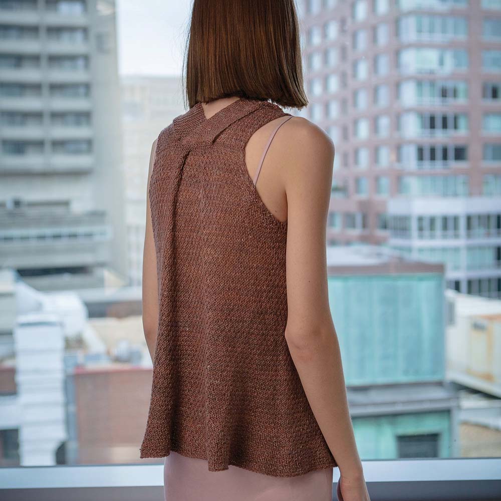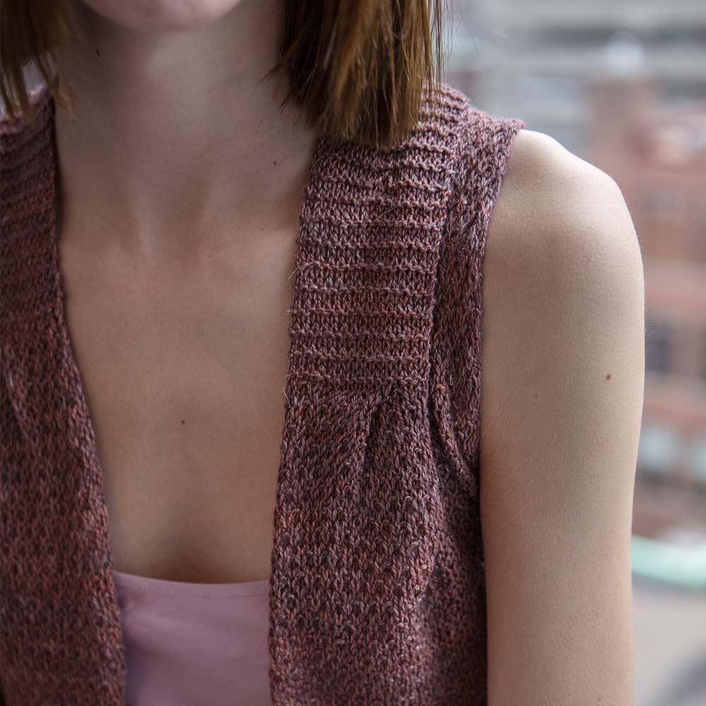 The vest is worked in one piece from the bottom to underarm, then split into the back and two fronts. There are two different ways to wear this versatile piece. The center front straps can be worn crossed in front or not crossed.