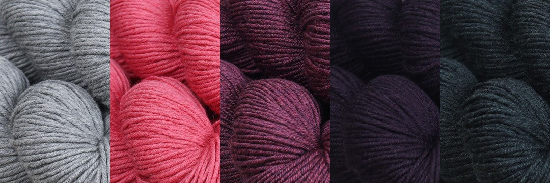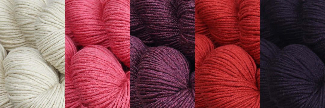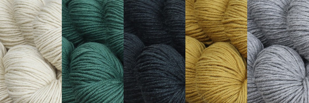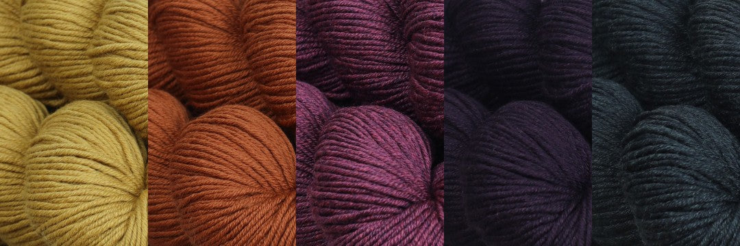 The Fibre Co. Herb & Hue (100% extra fine Merino wool, 214 m (234 yd) per 100 g hank) in shades Tibetan Plateau (A) – 1 hank, Khmer Spice (B) – 1 hank, Venetian Terrace (C) – 1 hank, Byzantium Velvet (D) – 1 hank, and Black Forest (E) – 1 hank.