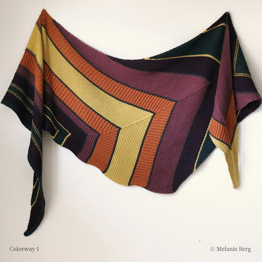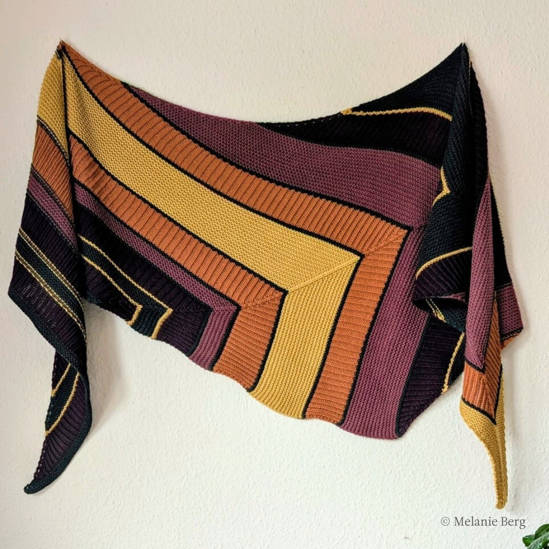 Crush Season is worked flat, from the right tip towards the left edge, with a center stitch going all the way through the shawl. At first, the stitch count on both sides of the center stitch increases, and once the final width is reached, one side stops increasing. That way, the center stitch slowly shifts from the center towards the left (lower) side of the shawl. Once it has reached it, all stitches are bound off.