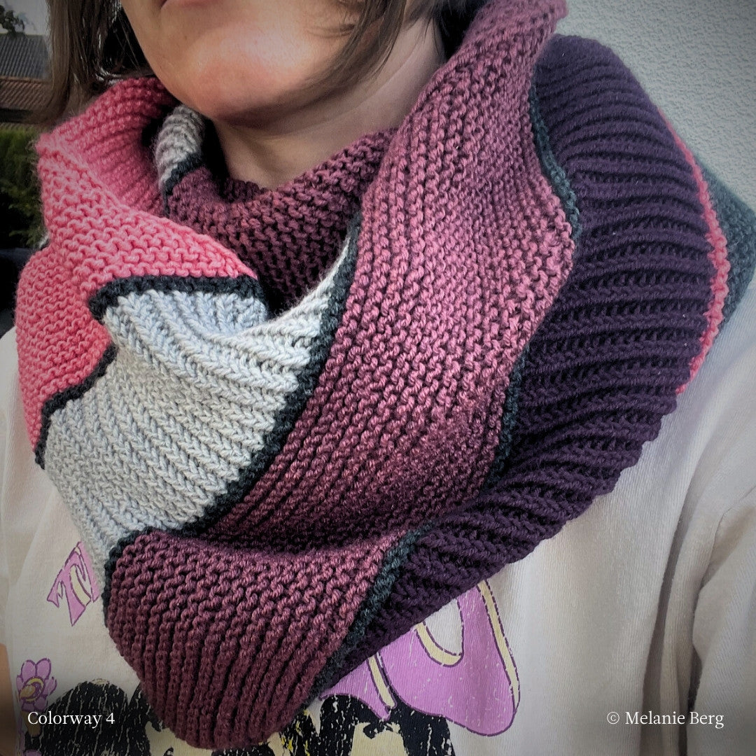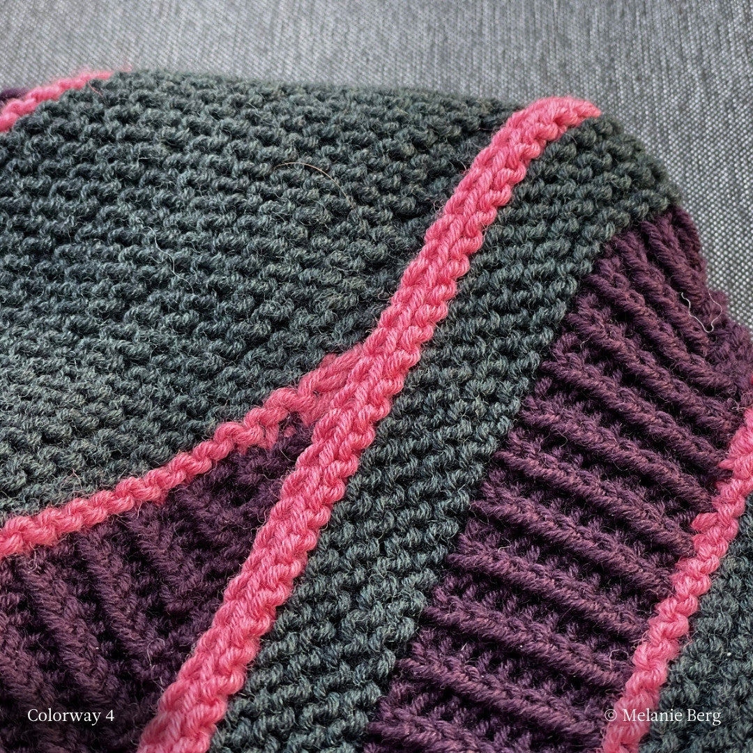 Colorway 3—Note from sample knitter: For the last 5 repeats of Section 3 in color E, I lined it with color B instead of color A for an extra pop.