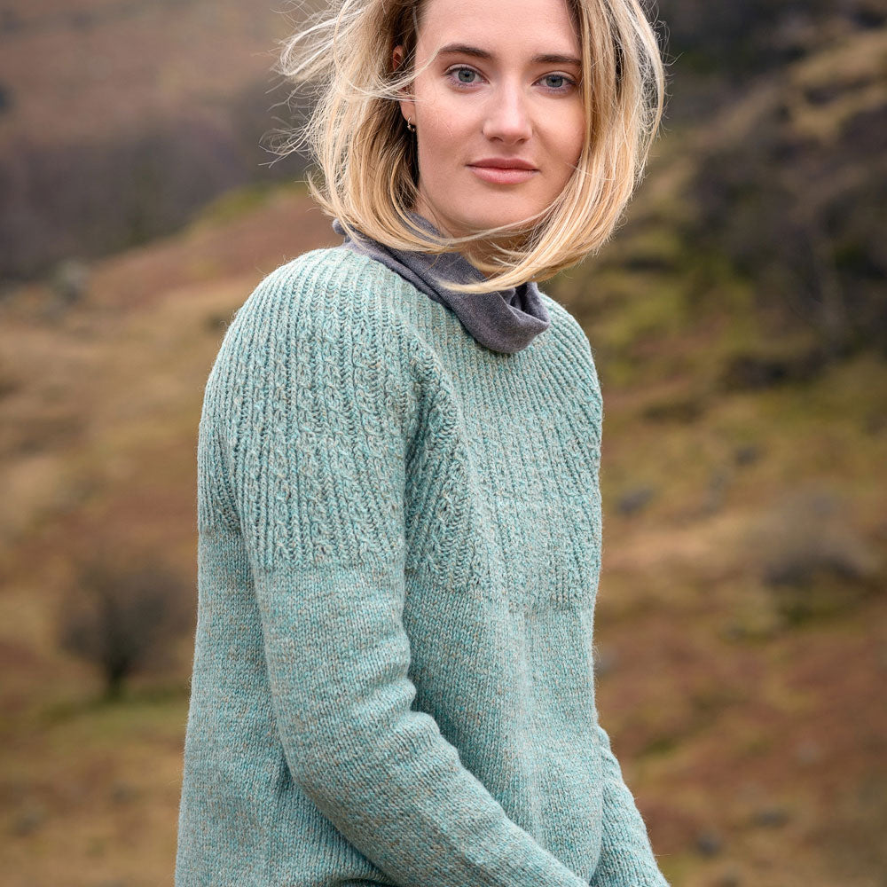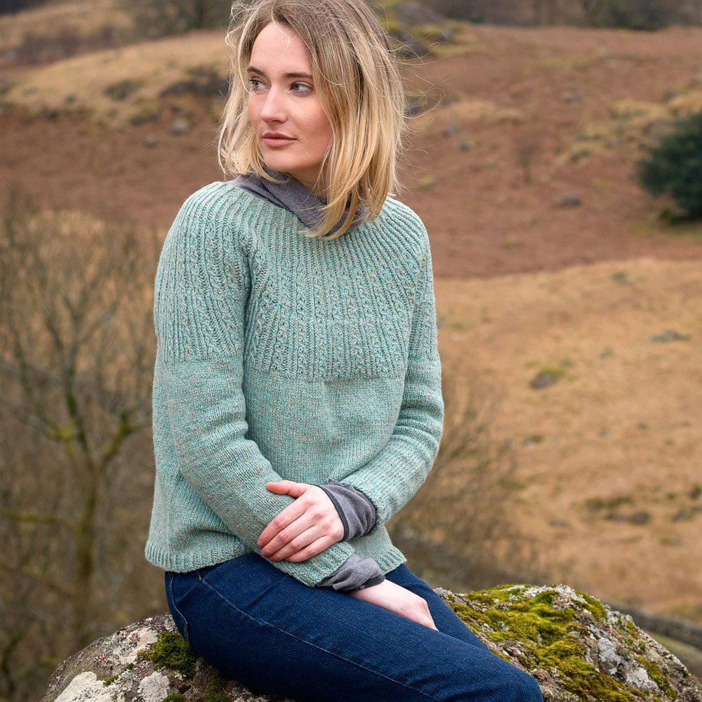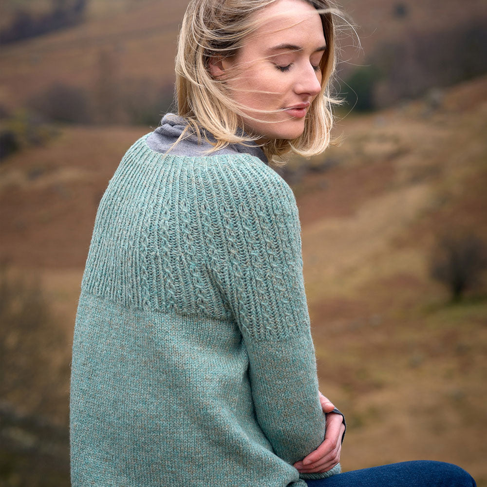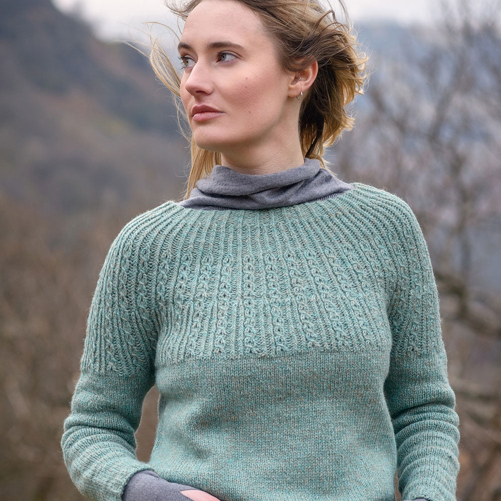 Deep Moss Pot is a twist on the traditional yoked sweater featuring a textural mock cable design. Knitted from the top down in Lore, the yoke increases are cleverly worked into the twisted stitch and rib pattern that encircles the shoulders.