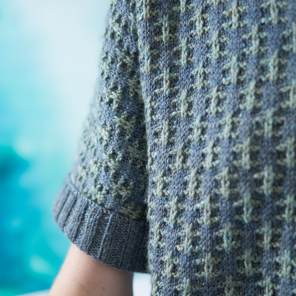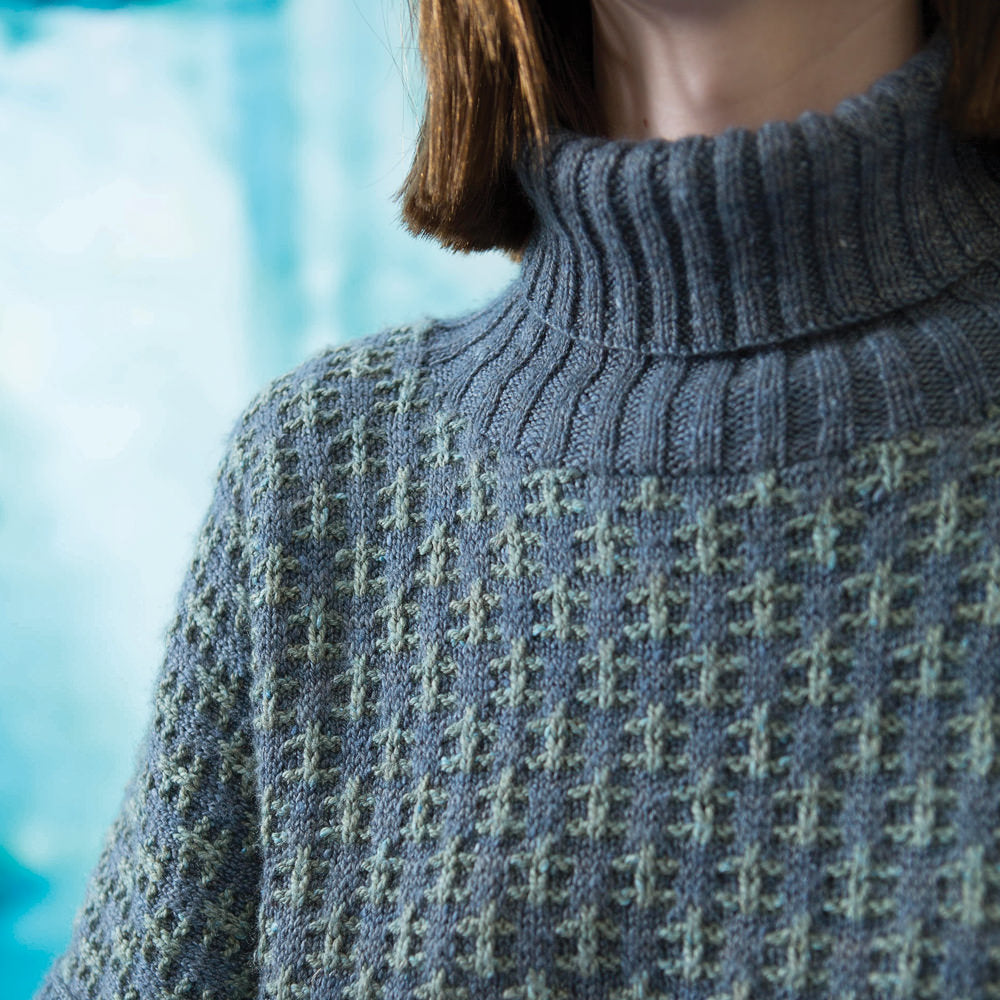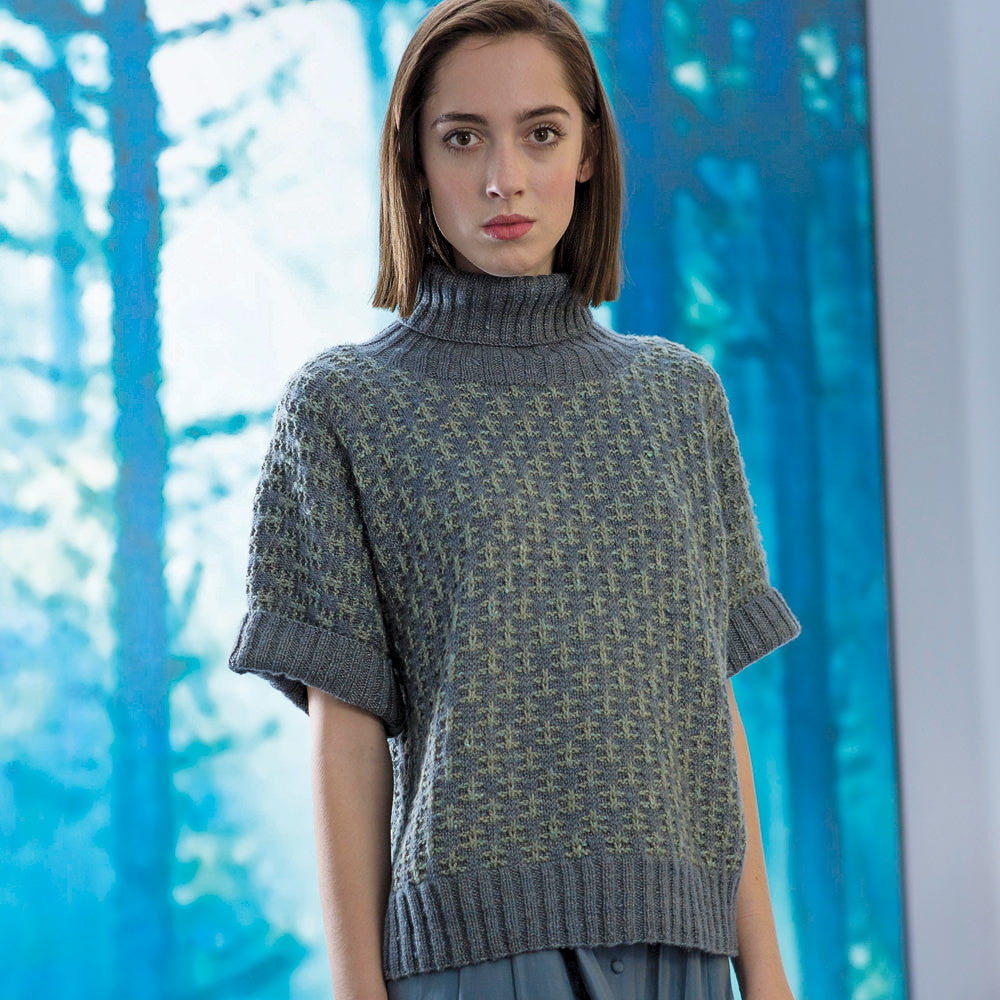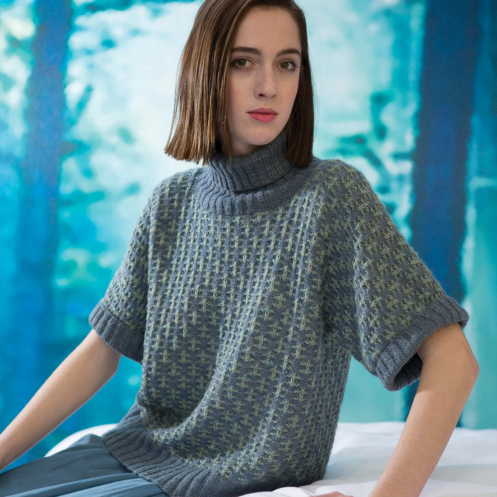 The District short-sleeve pullover by Norah Gaughan pairs a striking mosaic pattern with a cozy turtleneck for a modern, sophisticated look. Knit in The Fibre Co. Acadia—a luxurious blend of merino wool, baby alpaca, and silk noil—it offers a soft yet textured fabric with subtle sheen. Acadia’s warmth, breathability, and gentle drape make this pullover comfortable, durable, and effortlessly elegant.