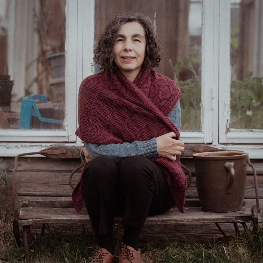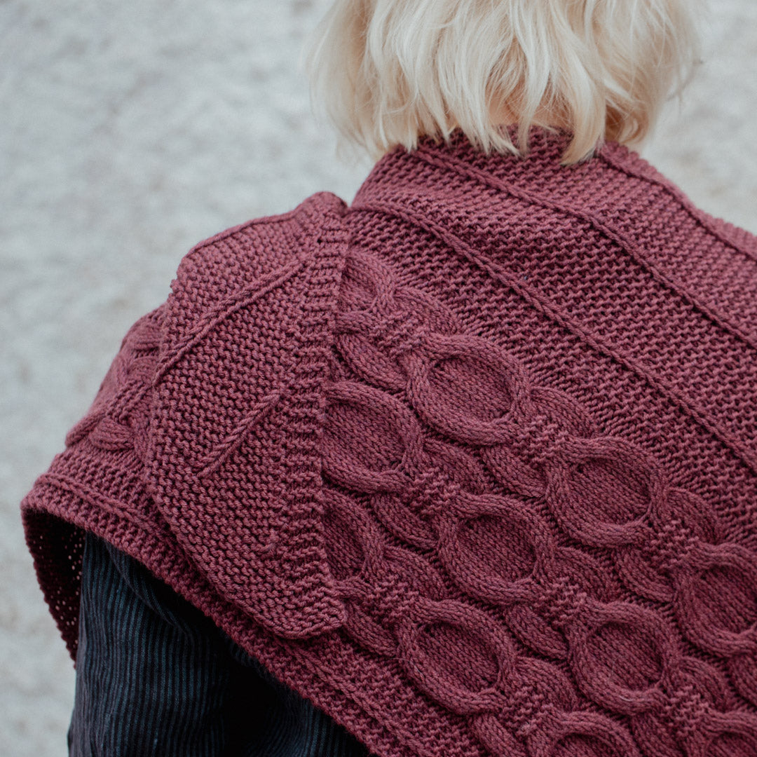 Knitted in The Fibre Co.’s Herb & Hue, this plant-dyed extra-fine Merino brings remarkable softness and complex, living color to every stitch. The yarn’s round, plump texture makes garter stitch irresistibly squishy while allowing the offset cables to shine with crisp definition.