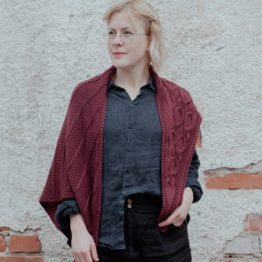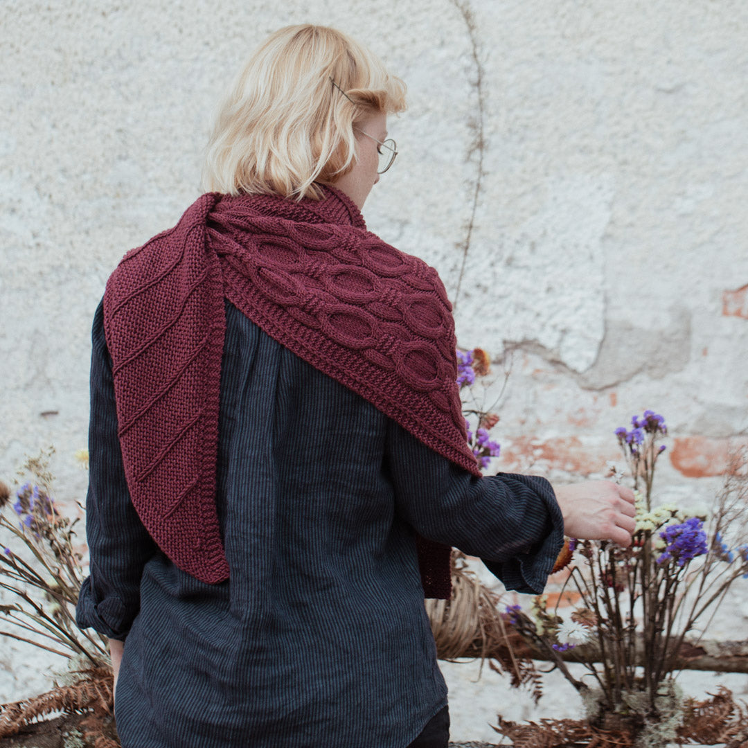 Drawing inspiration from a vintage Swedish cable pattern, the Global Shift Shawl showcases the distinctive offset globe cables that define the Global Shift Collection. This asymmetrical triangle begins at a narrow corner and grows with each row, featuring eye-catching cable panels running along the straight edge. The soft garter stitch base is punctuated by subtle vertical stripes created with slipped stockinette stitches, adding depth and visual interest to the squishy, textured fabric.