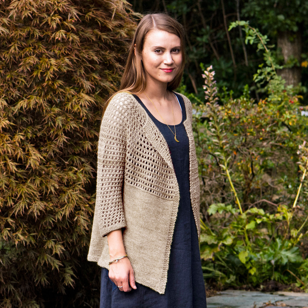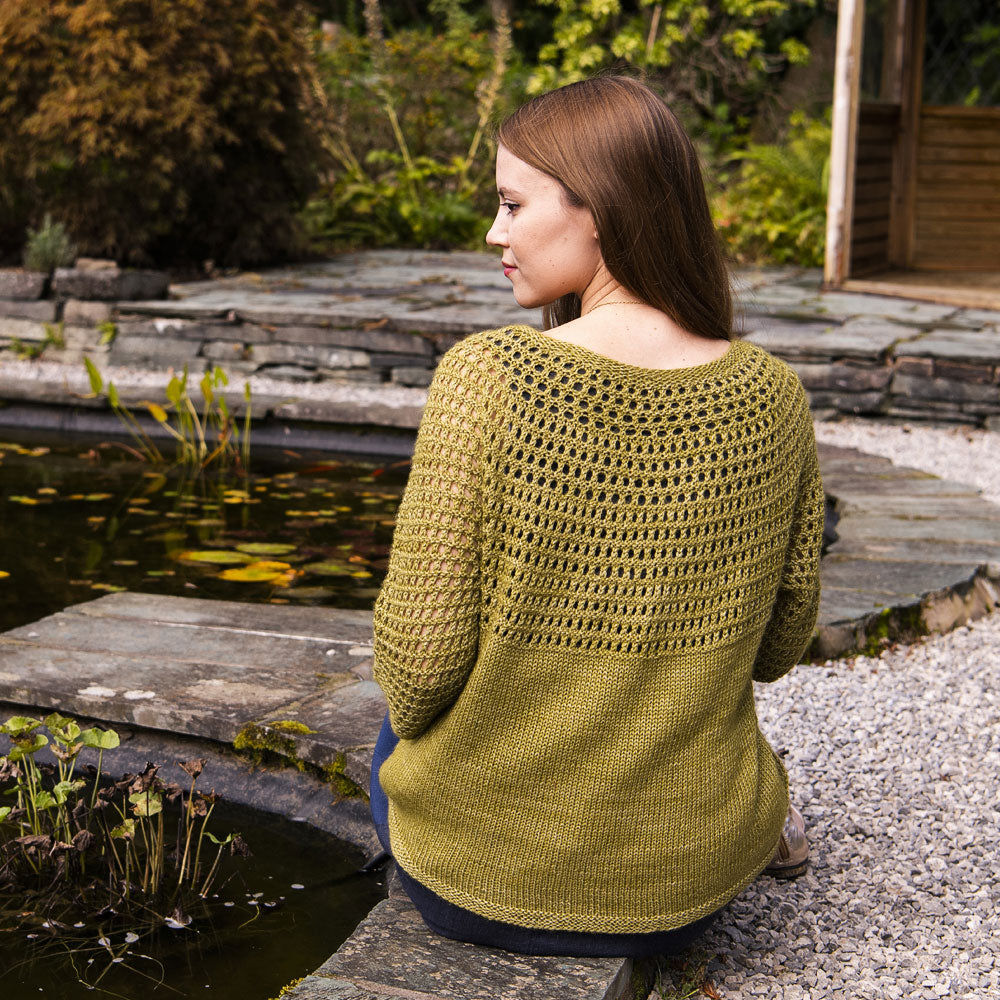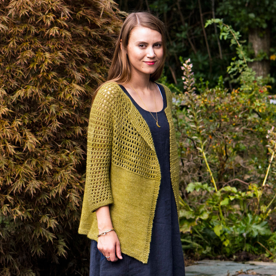 Greenall is a yoke cardigan with a striking eyelet stitch across the upper body and sleeves. It was knit seamlessly in one piece in the luxurious Road to China Light making this cardigan a pleasure to wear.