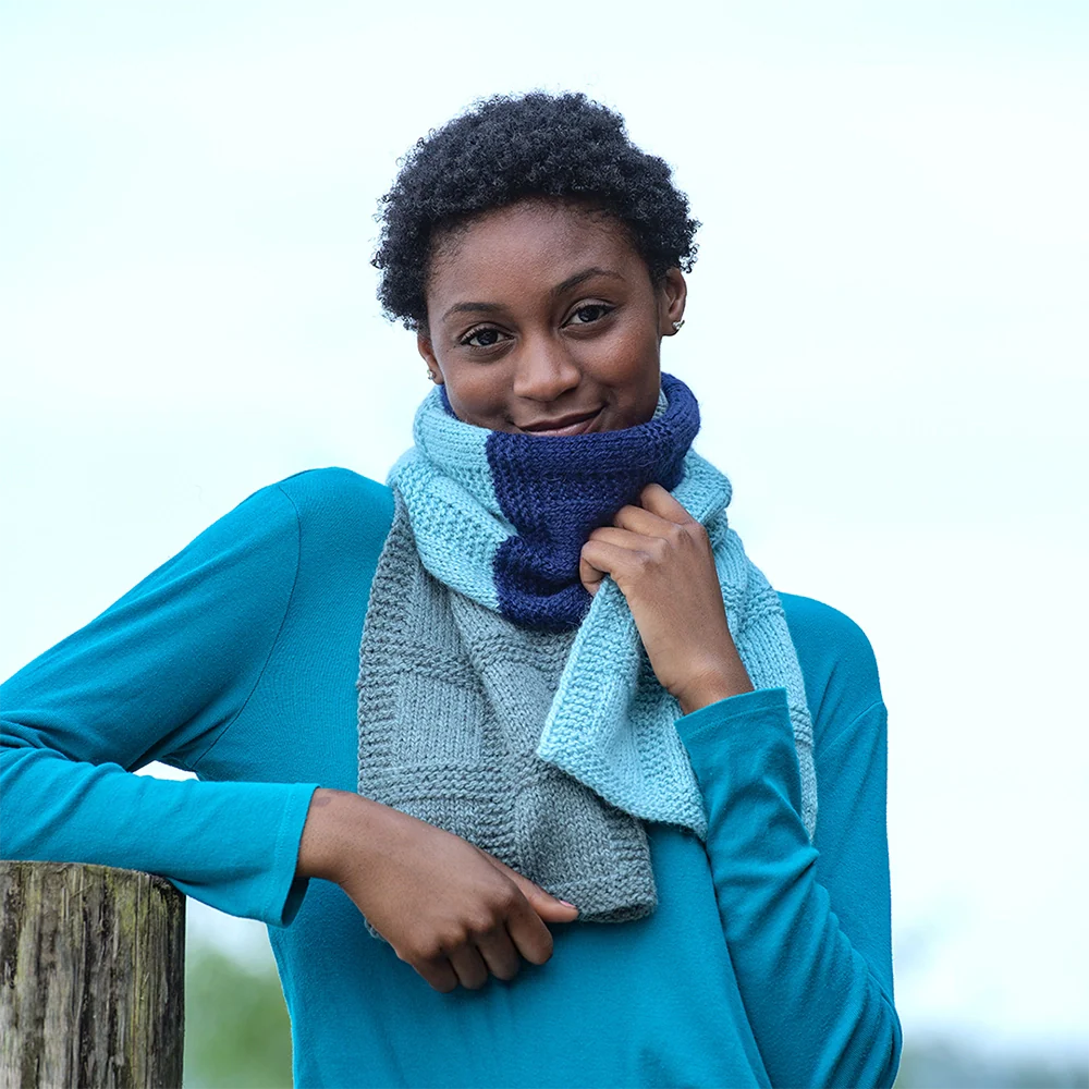 The Gridland Scarf is a beginner-friendly project utilizing the beauty of simple knit and purl stitches to make a big warm hug of a scarf. Designed to be a staple of the wardrobe in the cooler months, with minimalist, genderless style, and subtle details, and once you have knit your scarf, there are many ways to wear it!