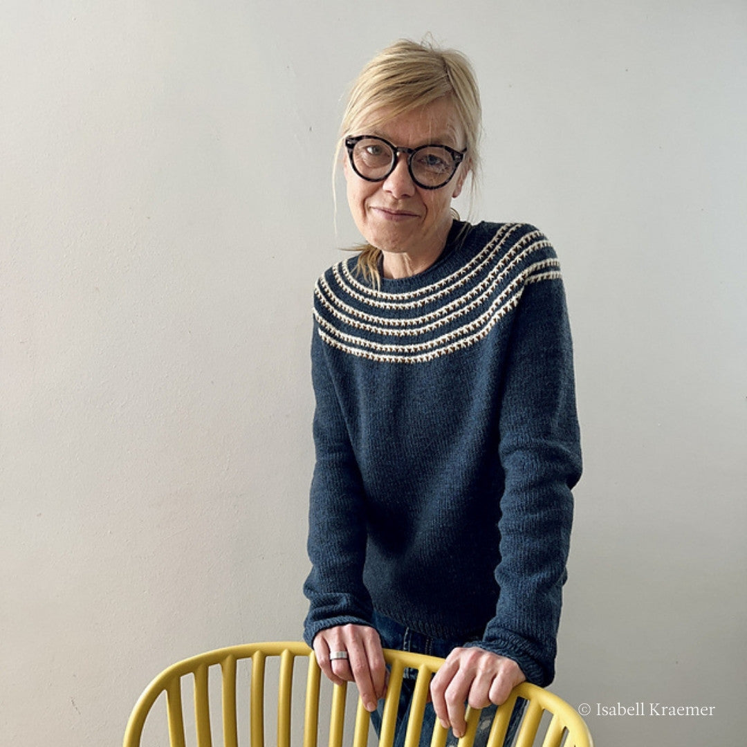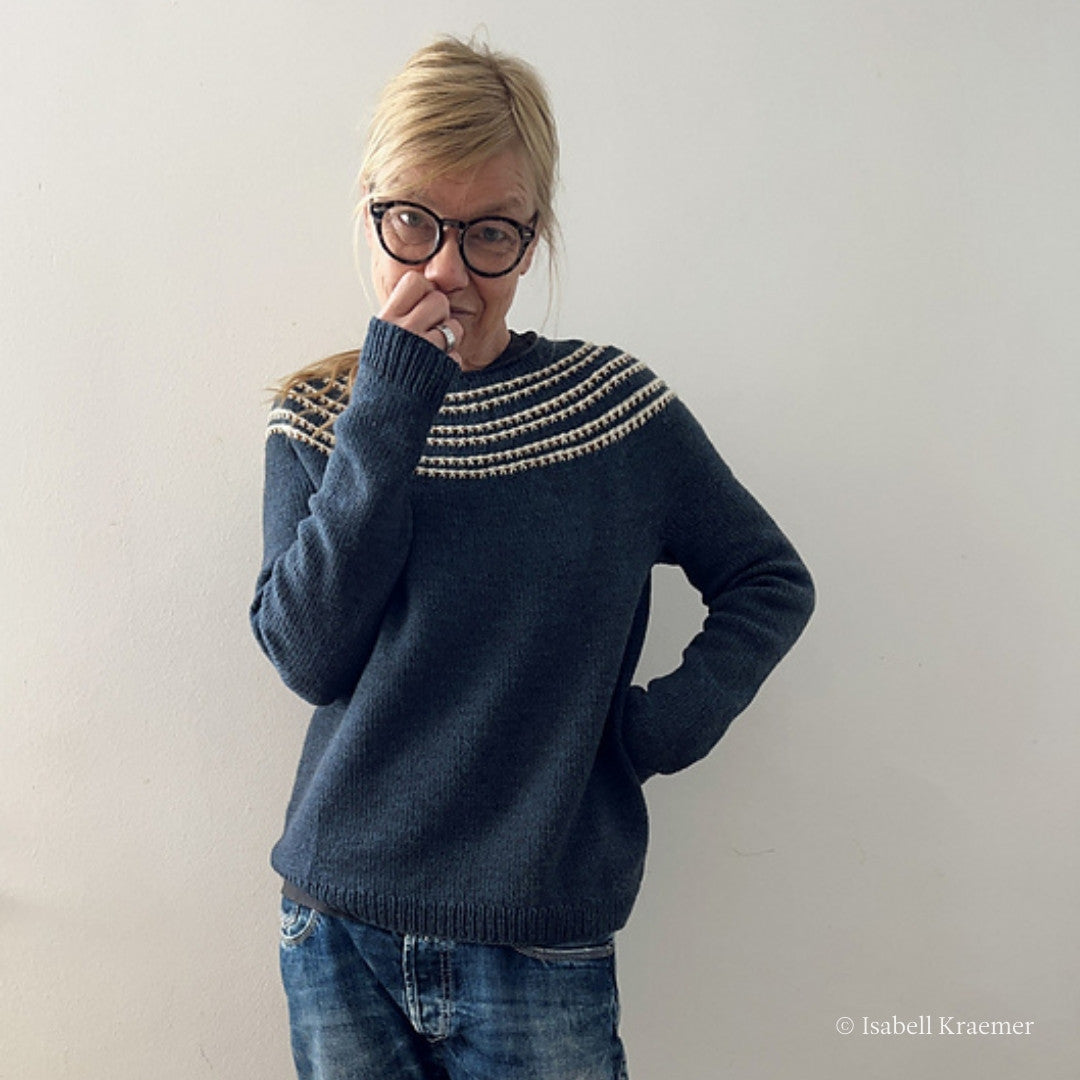 Helmi is a beautiful yoke sweater featuring a bold colorwork design on the yoke. The sweater is worked seamlessly from the top down. Starting with the neck shaping, short rows are worked back and forth to create a higher back neck. The yoke featuring a simple slipped stitch pattern is then worked in the round to sleeve separation. Sleeve stitches are placed on hold to work the body top down to the ribbing first. The sleeves are then worked top down to the cuffs. Optional neck finishing can be worked last.