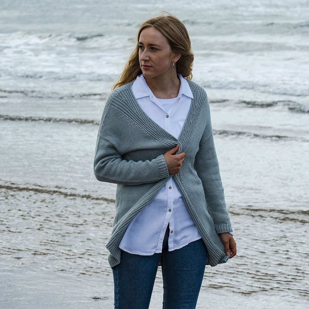 Heritage Coast is an easy-to-wear, open-front cardigan with drop shoulders. It features a radiating twisted rib that travels across the back and over the front edges of the cardigan. Lightweight Luma makes it an excellent layering piece for your collection of knitwear.