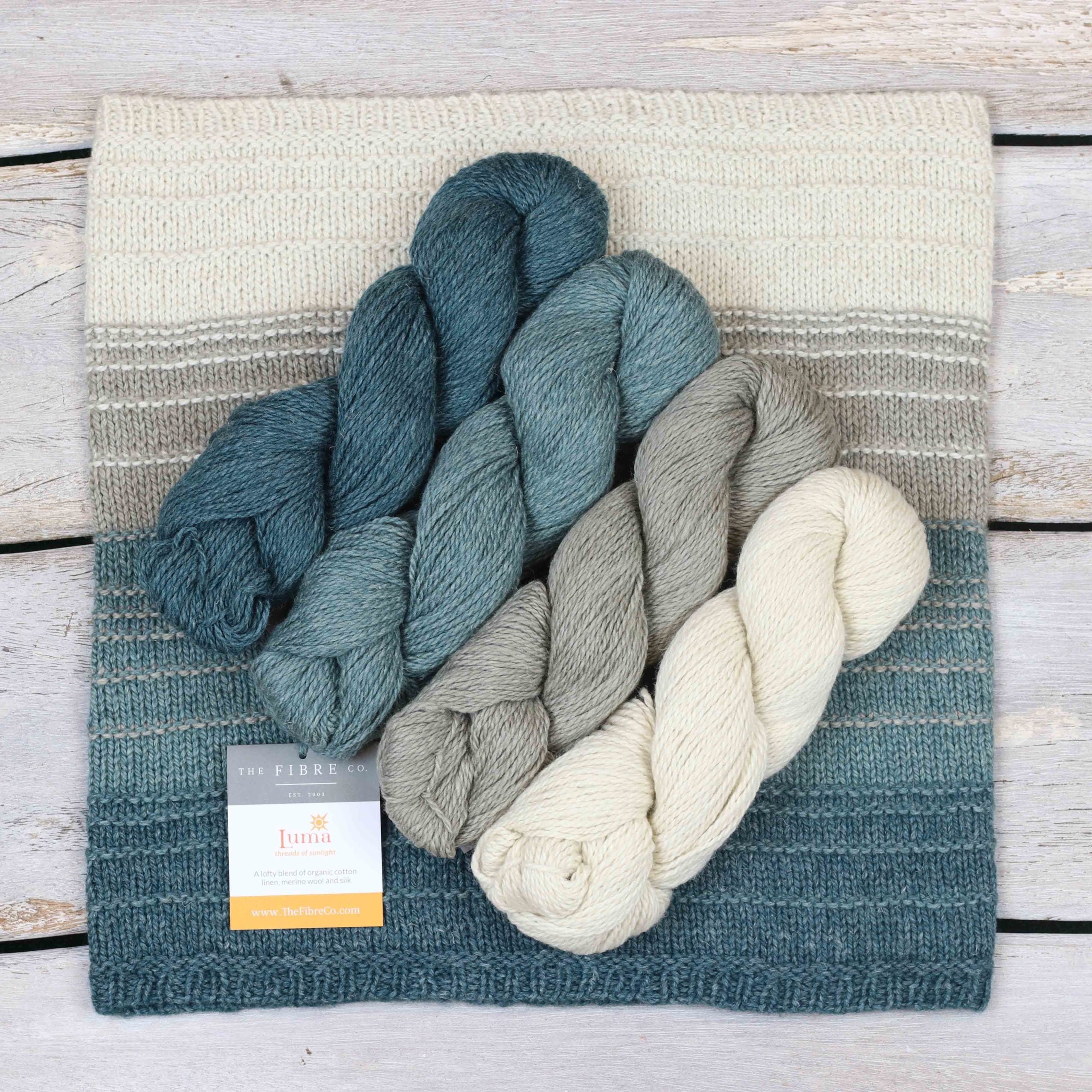 The Fibre Co. Luma (50% Merino wool, 25% organic cotton, 15% linen, 10% silk, approx. 125 m (137 yd) per 50 g hank) – Aegean, Blue Dusk, Willow, Blanca – 1 hank each.