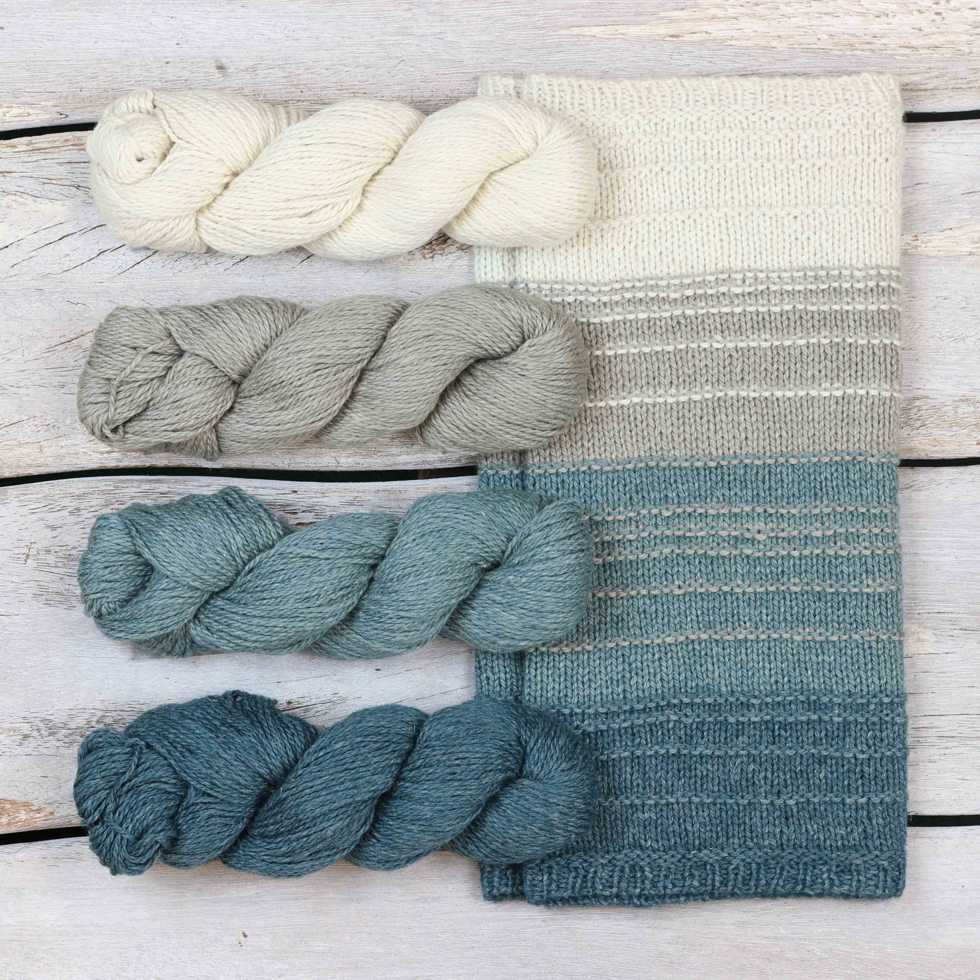In The Flow is a generously sized cowl with four stripe sections. This sample is knit in Luma and we also have samples for sale in Acadia and Lore.