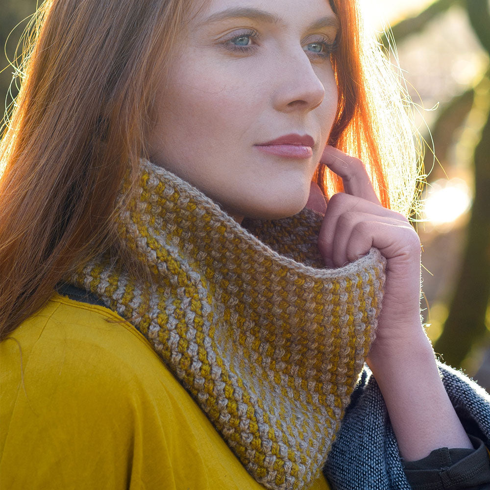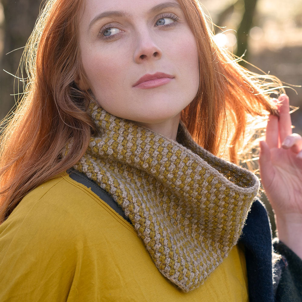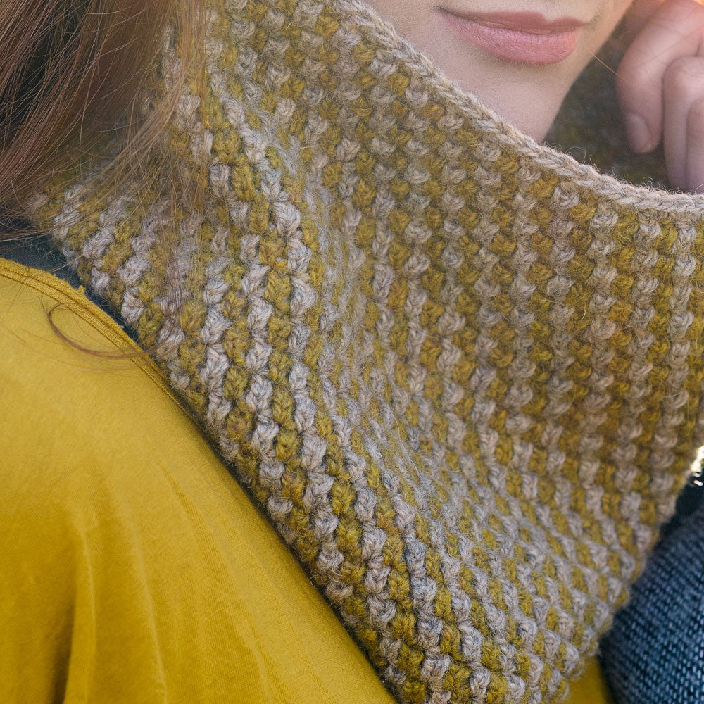 Knotts View is a stylish crochet cowl worked in two colours and a textured geometric stitch. It uses Lore to create a playful fabric that is as fun to crochet as it is to wear. Wear it around the house to keep your neck snuggly and warm or under your coat as a protective layer from the elements.