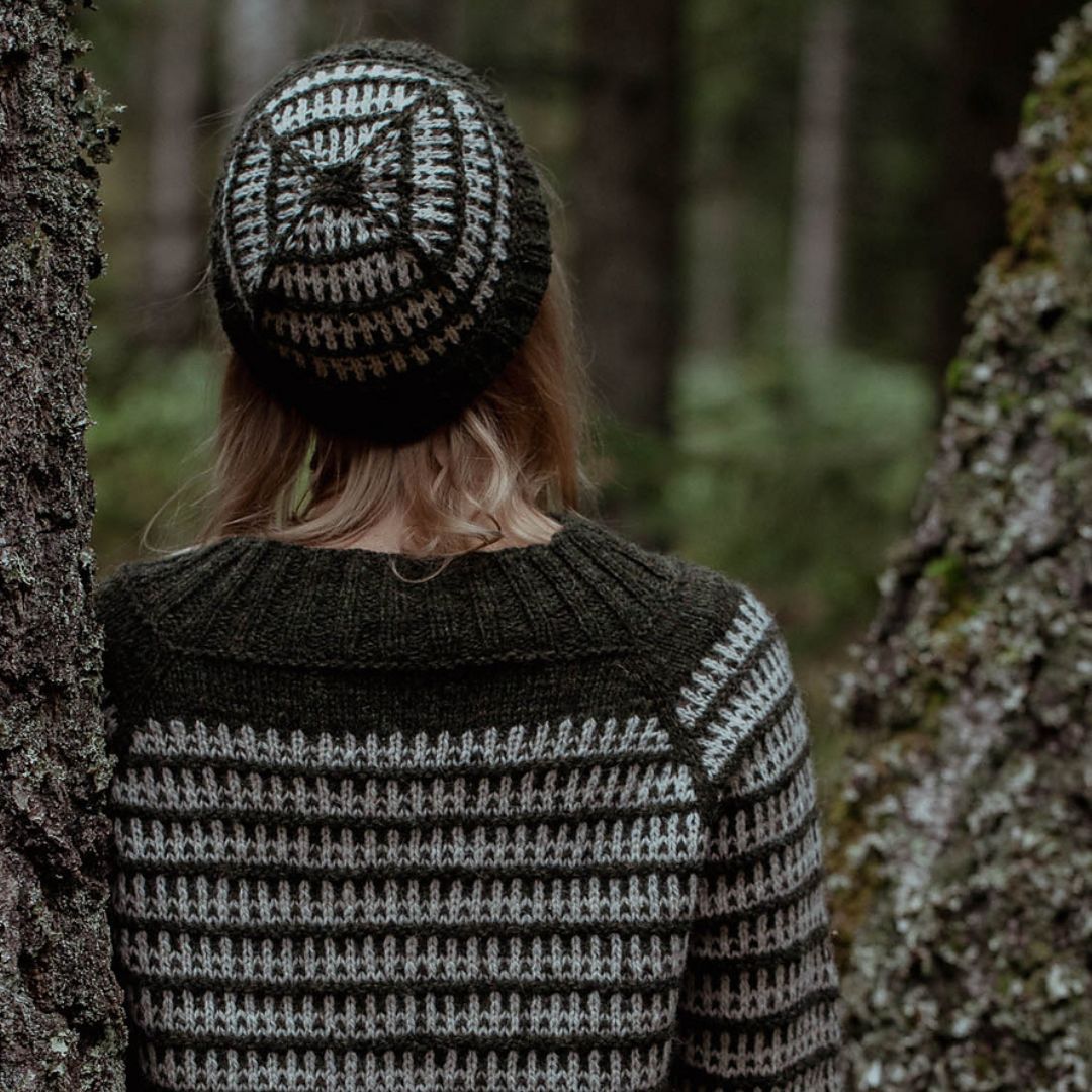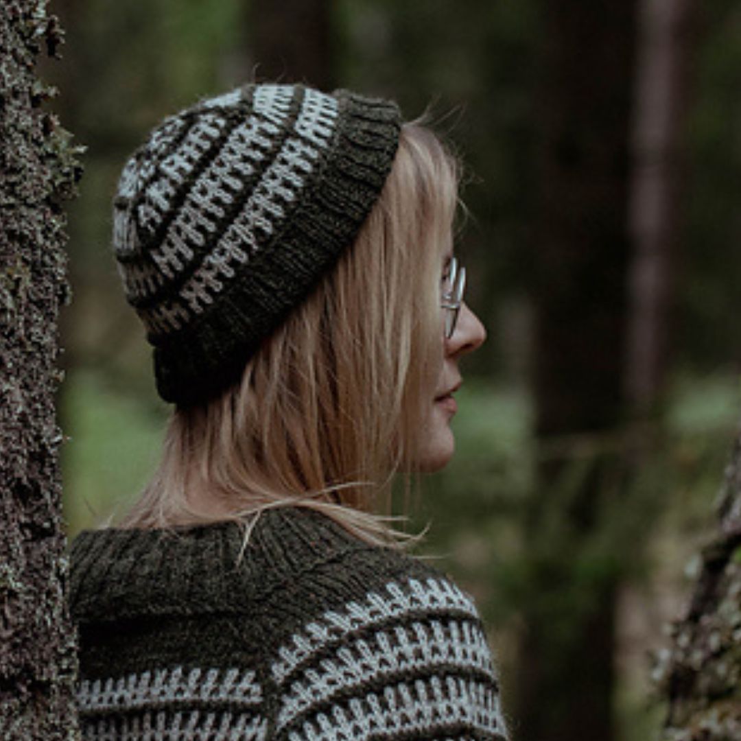 The Mushroom Hat is knitted in lofty Lore, made from 100% lambswool from the English Romney sheep breed. This soft woolen-spun yarn blooms beautifully after washing, making it perfect for this textured colorwork project.