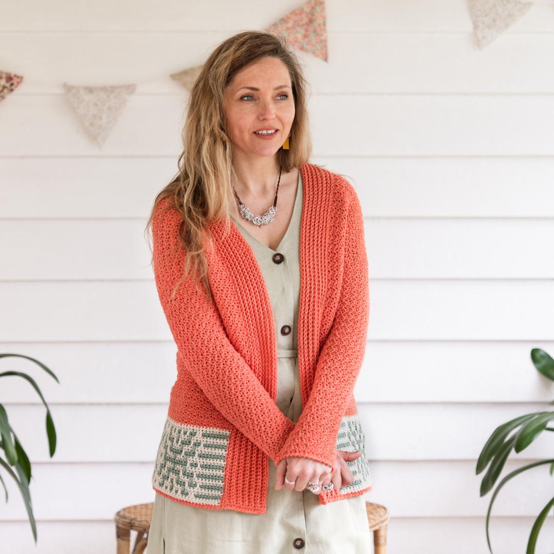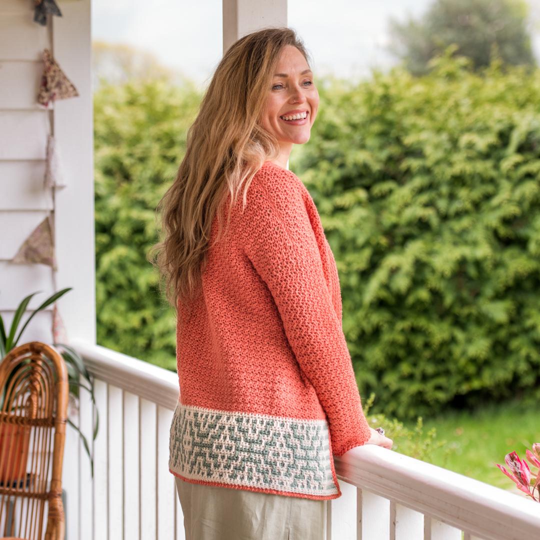 Sandra Gutierrez’s striking Paradise Cardigan is brimming with interesting details. It’s crocheted from the bottom up with pretty griddle stitch used for the main body, and a mosaic crochet border. The longline silhouette and fastening-free design give a relaxed summer look.