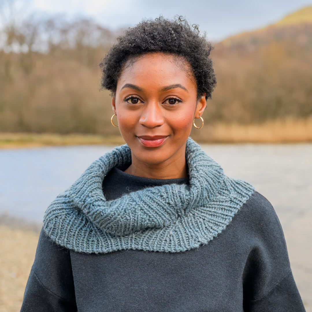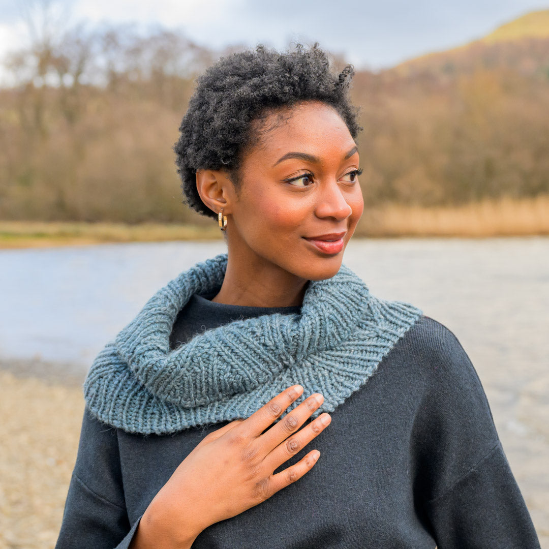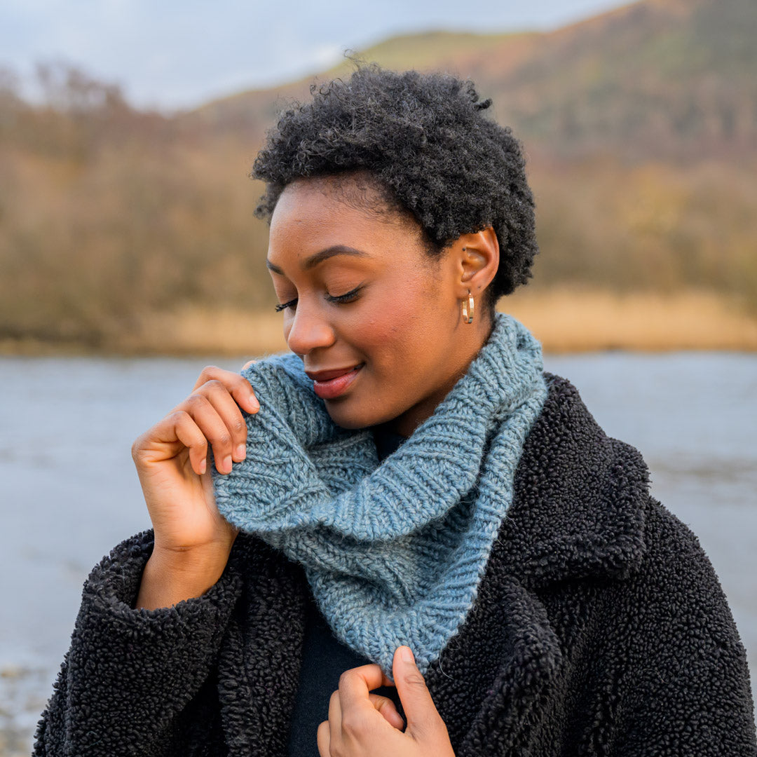 The Pelagic Cowl is made with Tundra, a bulky weight blend of fine Merino wool, baby alpaca, and silk that will provide lightweight warmth and a bouncy, soft fabric.
