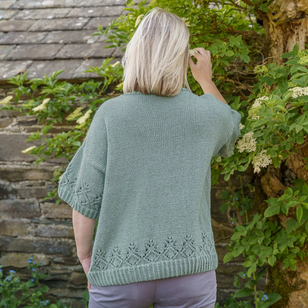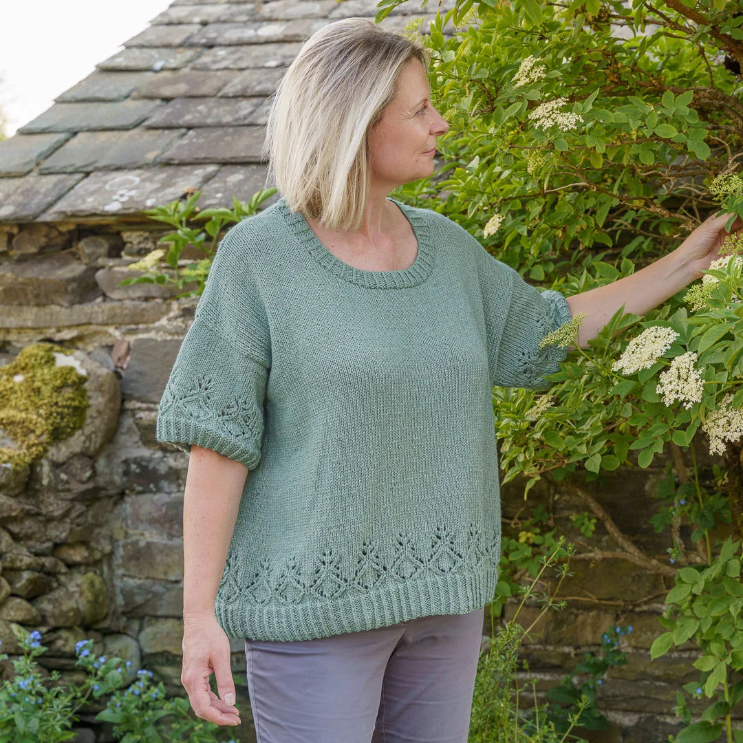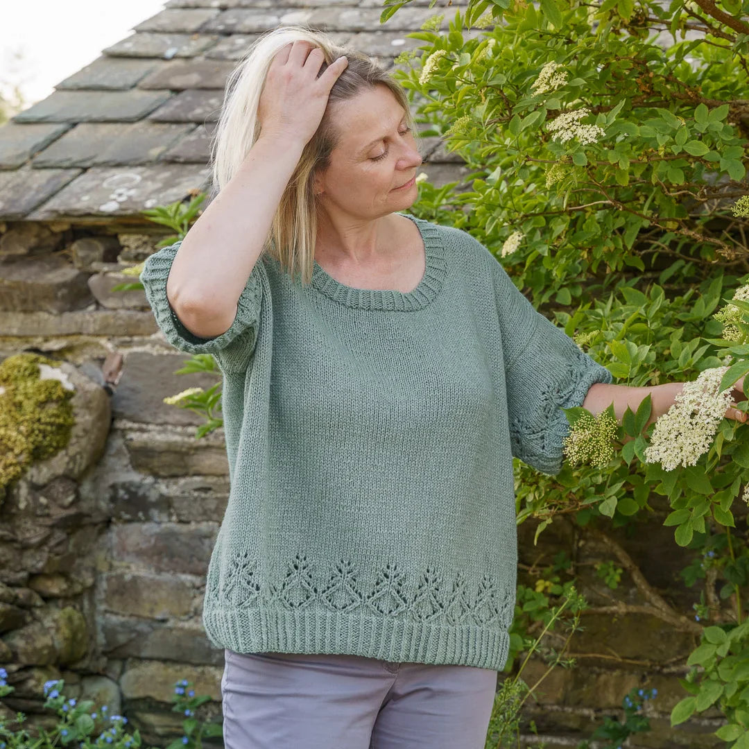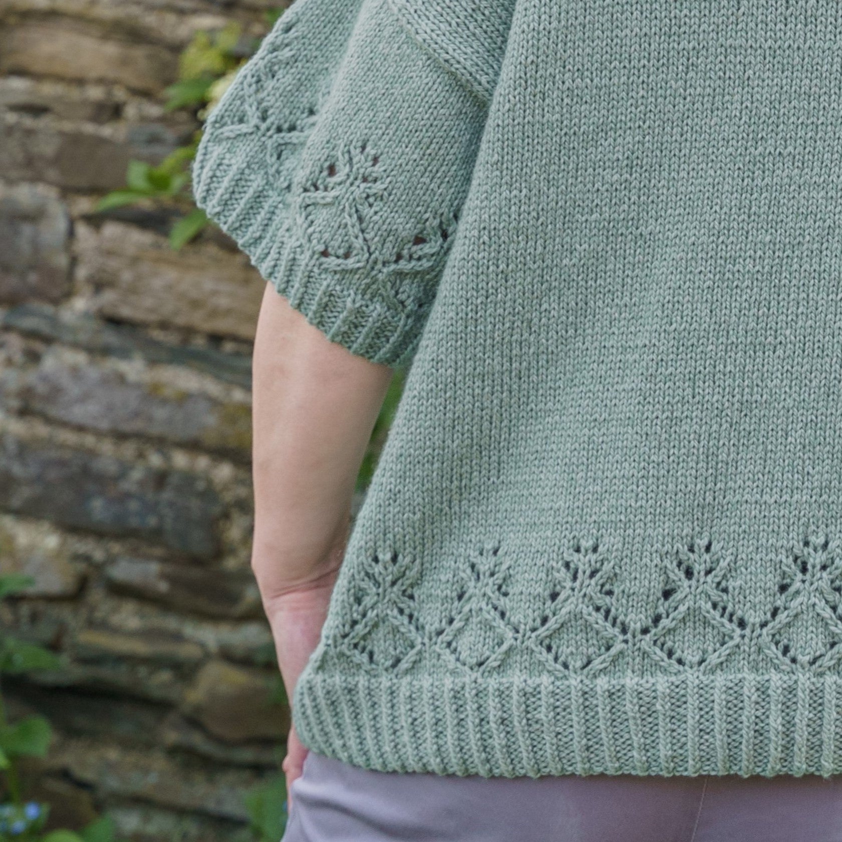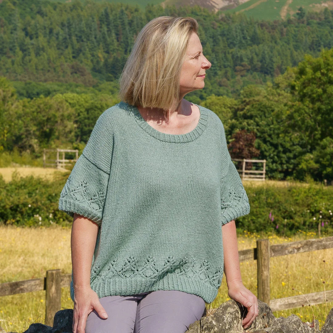 Embodying relaxed comfort, the Primavera Tee is straightforward in its elegance. This oversized tee is all about easy wearing, designed with a focus on loose, airy comfort. It features a stockinette stitch interspersed with an eyelet lace pattern at the hem and cuffs, adding a touch of detailed finesse. The twisted rib at the neck and sleeve edges provide a neat, tailored finish, ensuring the tee retains its shape.