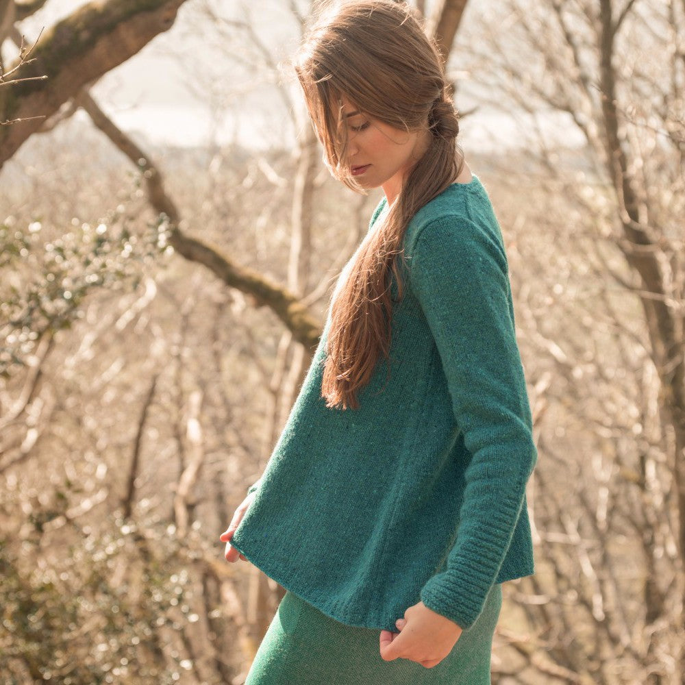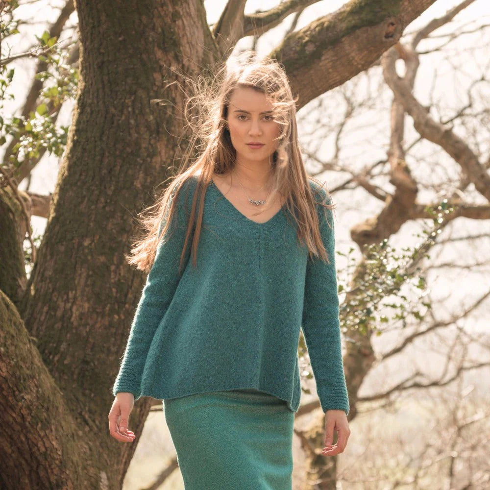 Designer, Holli Yeoh, created this v-neck sweater, which has a flattering a-line shape and subtle texture on the sleeves and along the neck.