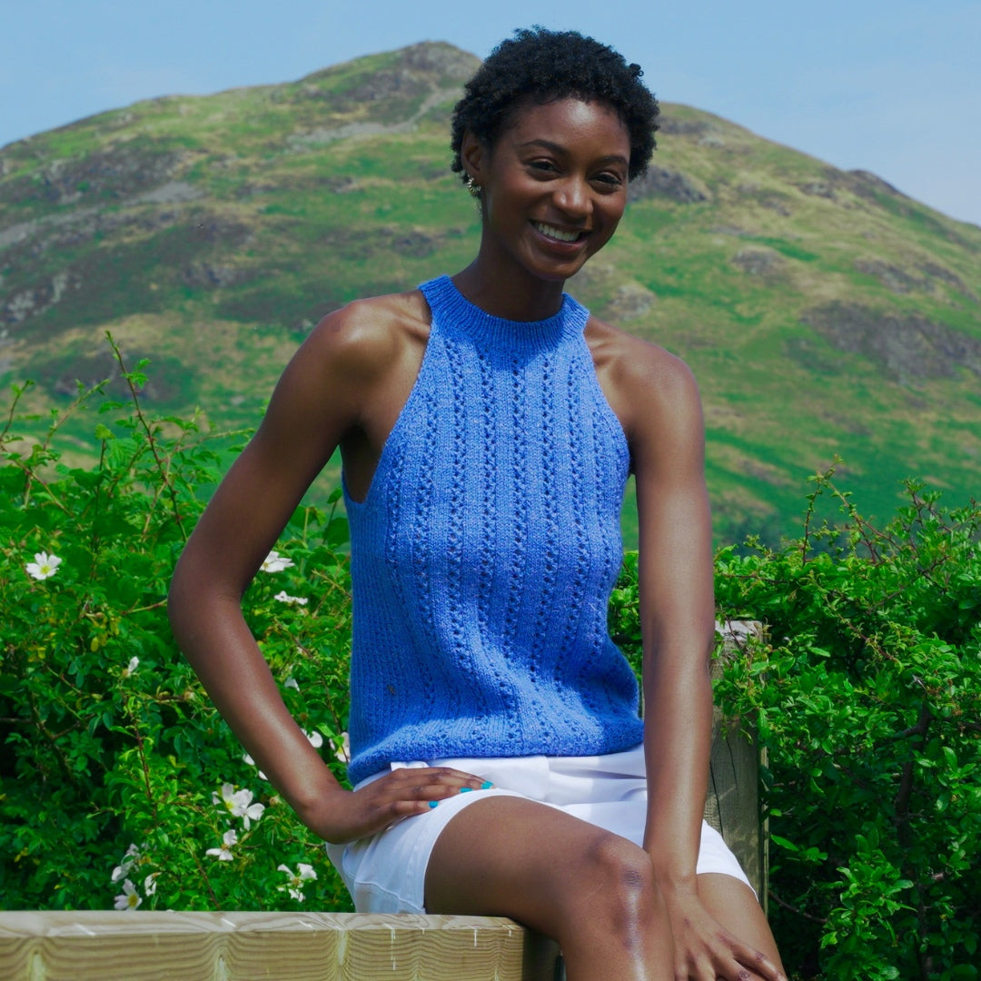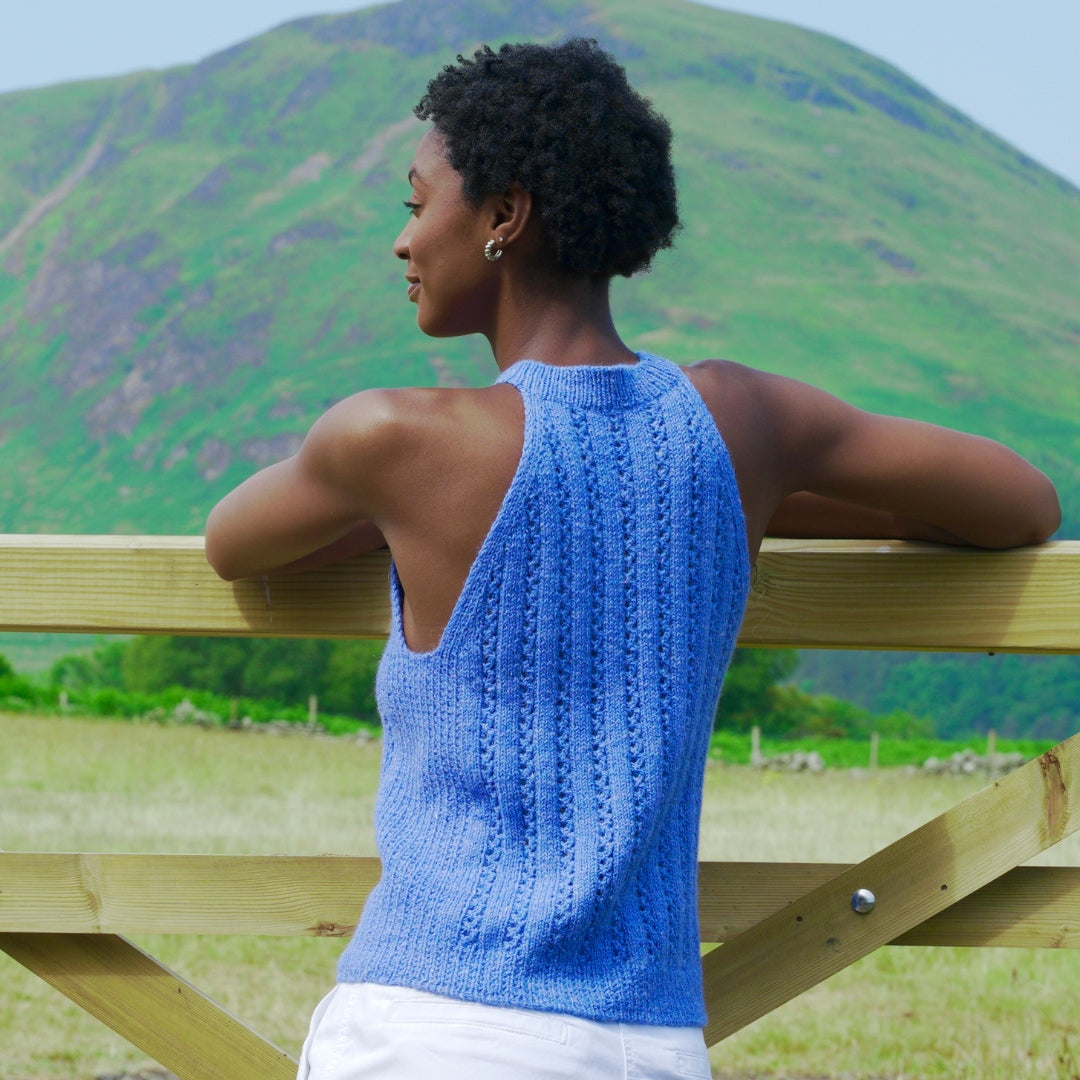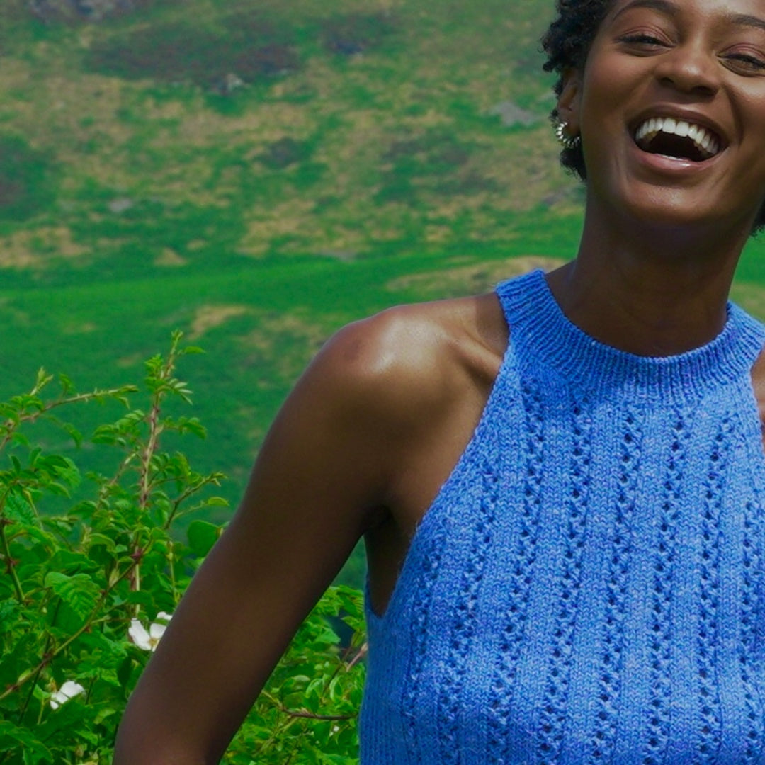 Knit in &Make DK, the Riptide Halter is elevated by the yarn’s unique blend of Highland wool, soft alpaca, and linen. This blend creates a breathable fabric with great stitch definition, making it the perfect choice for creating a versatile summer layer.