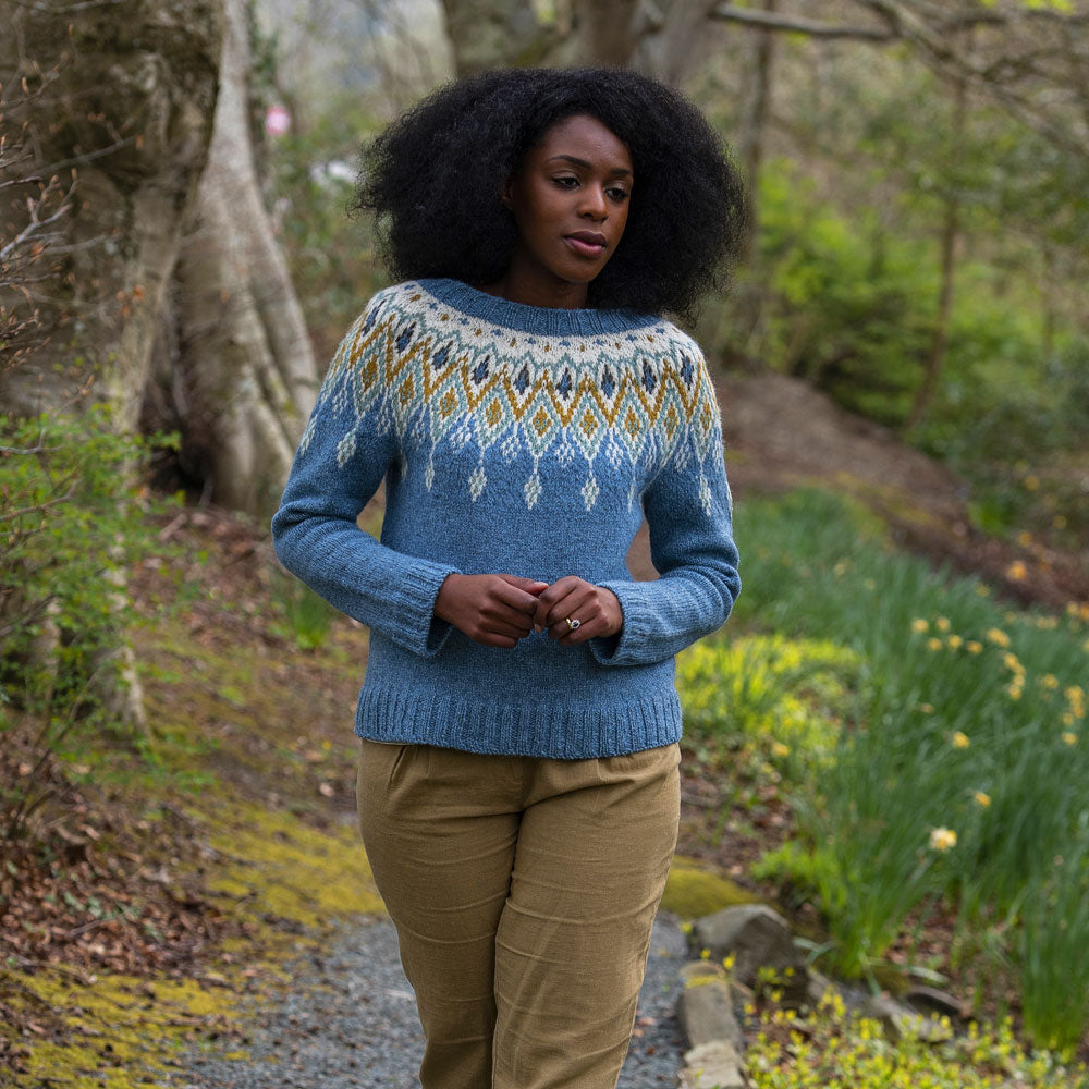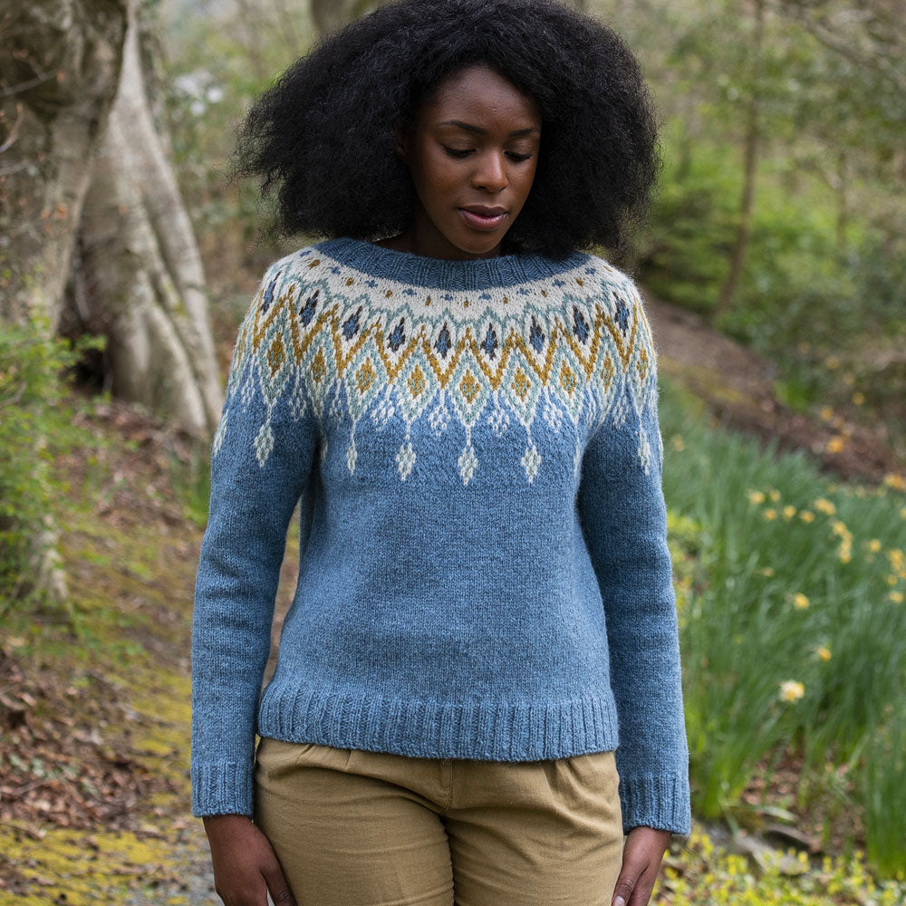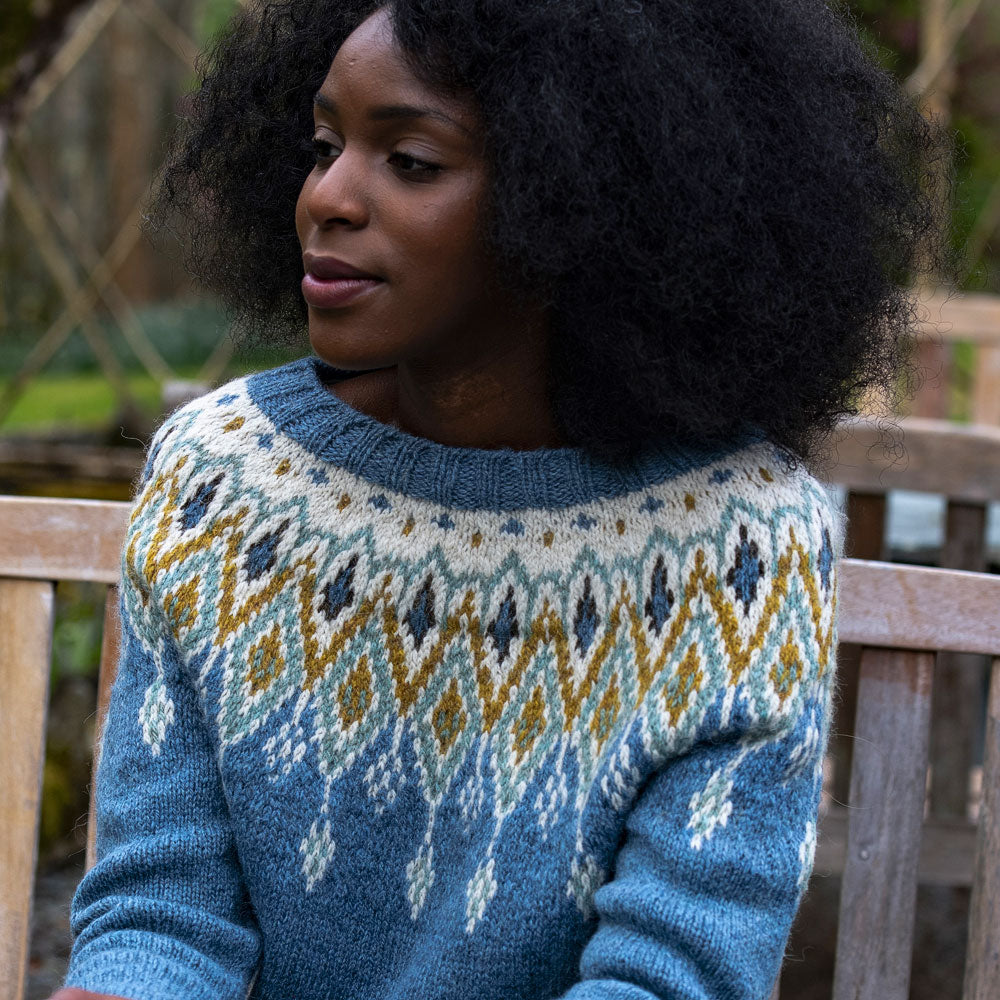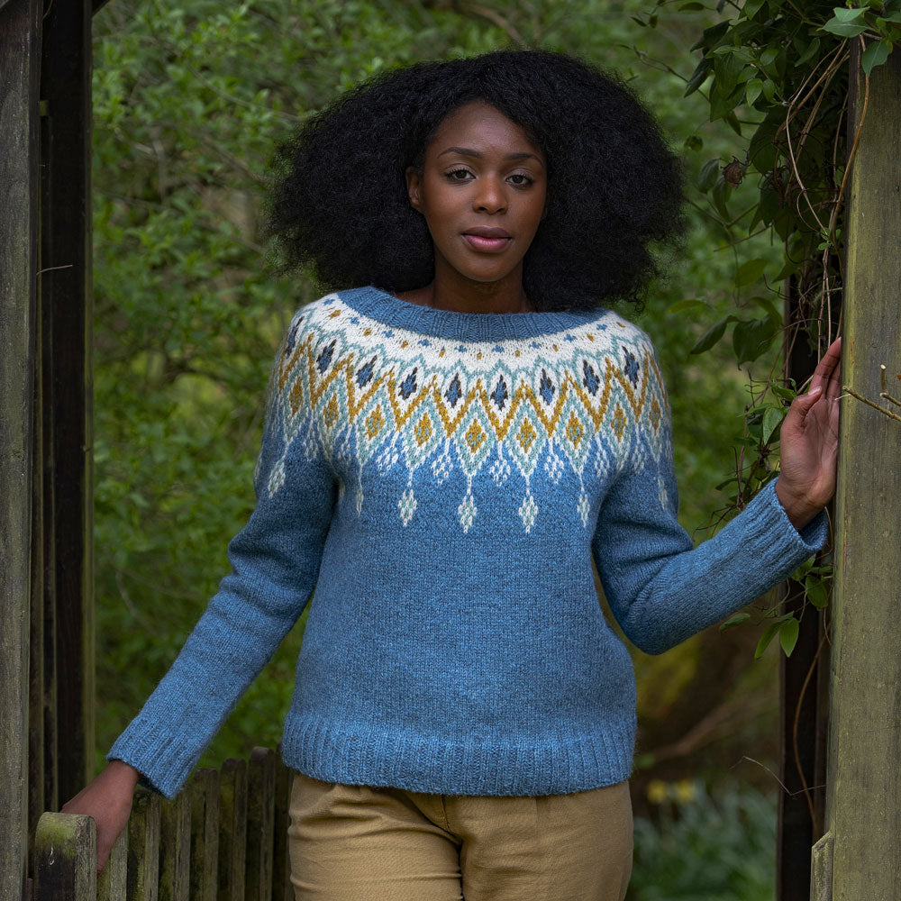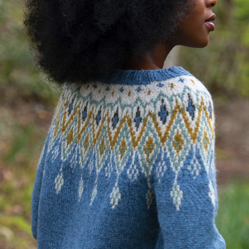 Seacross is a seamless sweater with a stunning five-color yoke. Lore creates a light and lofty fabric that blooms beautifully when washed.