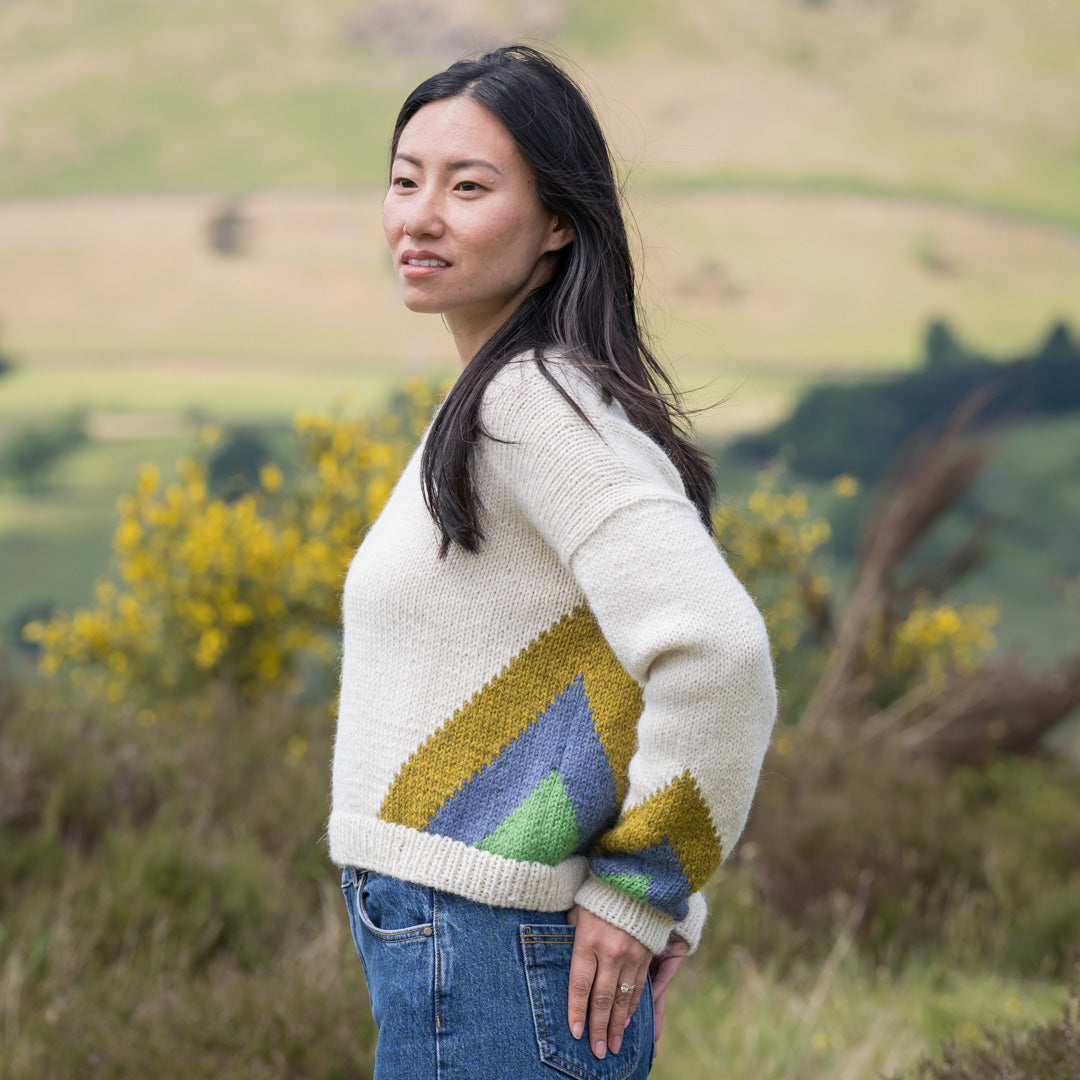 The Side Flash Sweater brings bold 80s sportswear energy into modern knitting with its striking intarsia panels and confident silhouette. This bottom-up pullover features dynamic colorwork that wraps around the body sides and continues onto the sleeves, creating movement and visual impact.