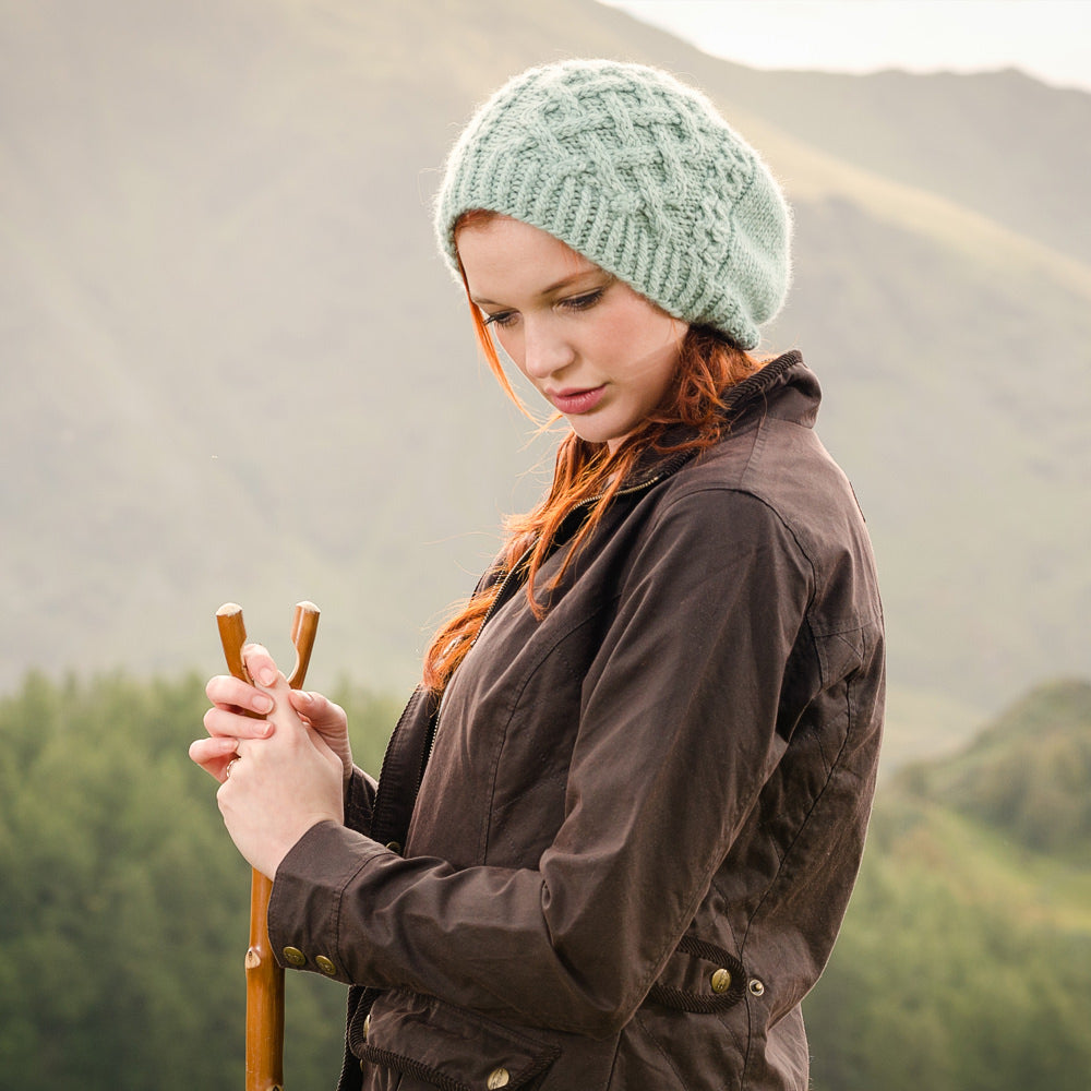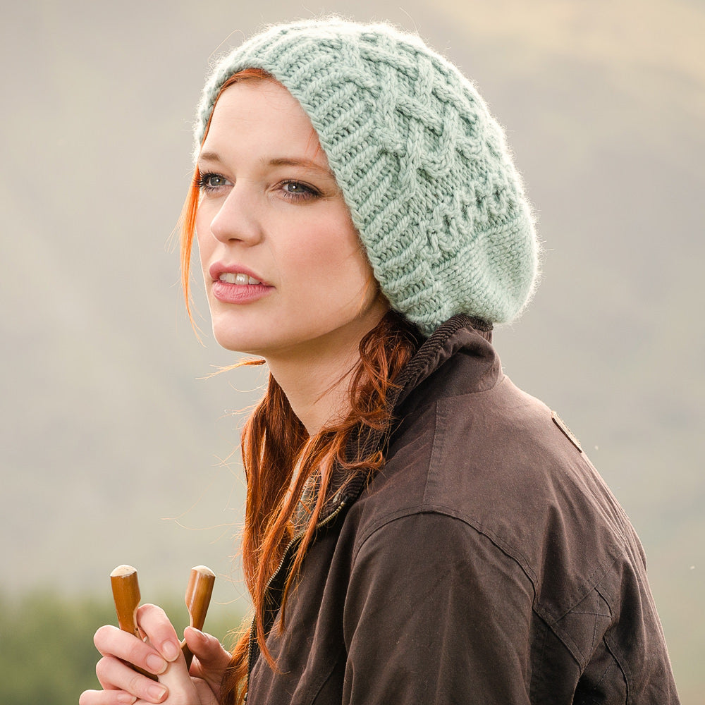 A slouchy hat with a broad cable panel, Skáidi is the perfect cozy chapeau for winter. Honeycomb cables along each side of the main panel are balanced by a third honeycomb cable on the far side. Worked in The Fibre Co.’s luxurious bulky Tundra, this is a great idea.