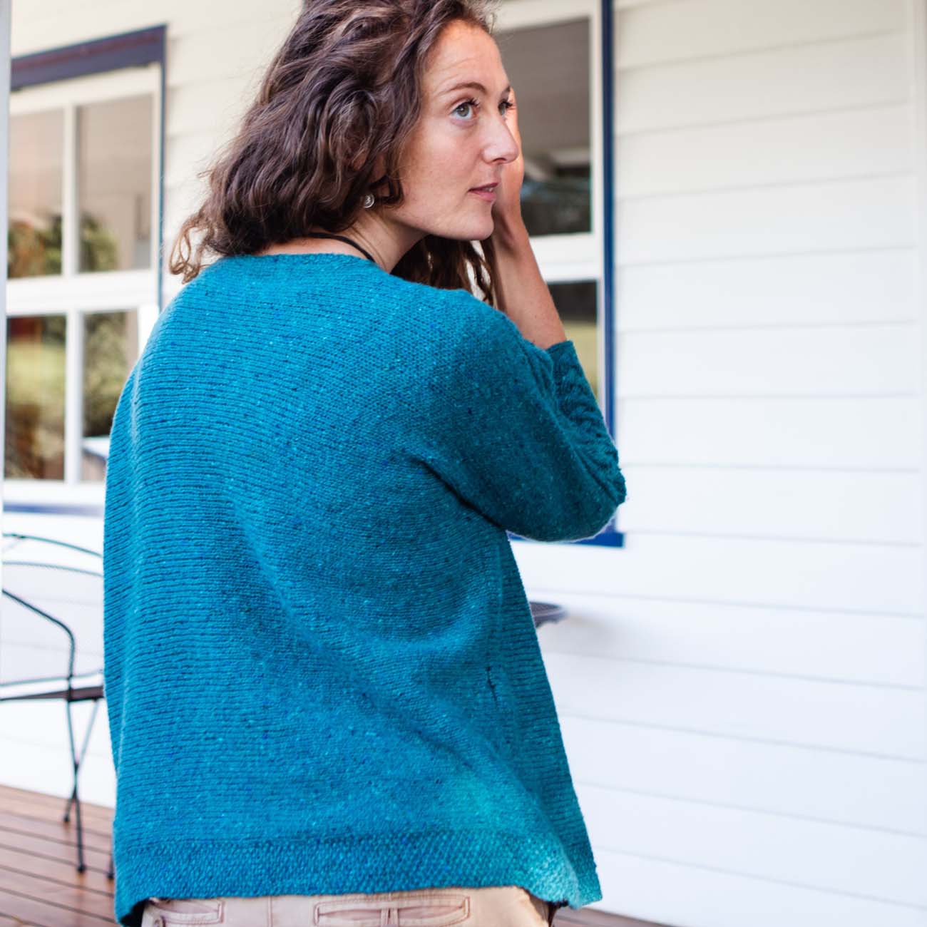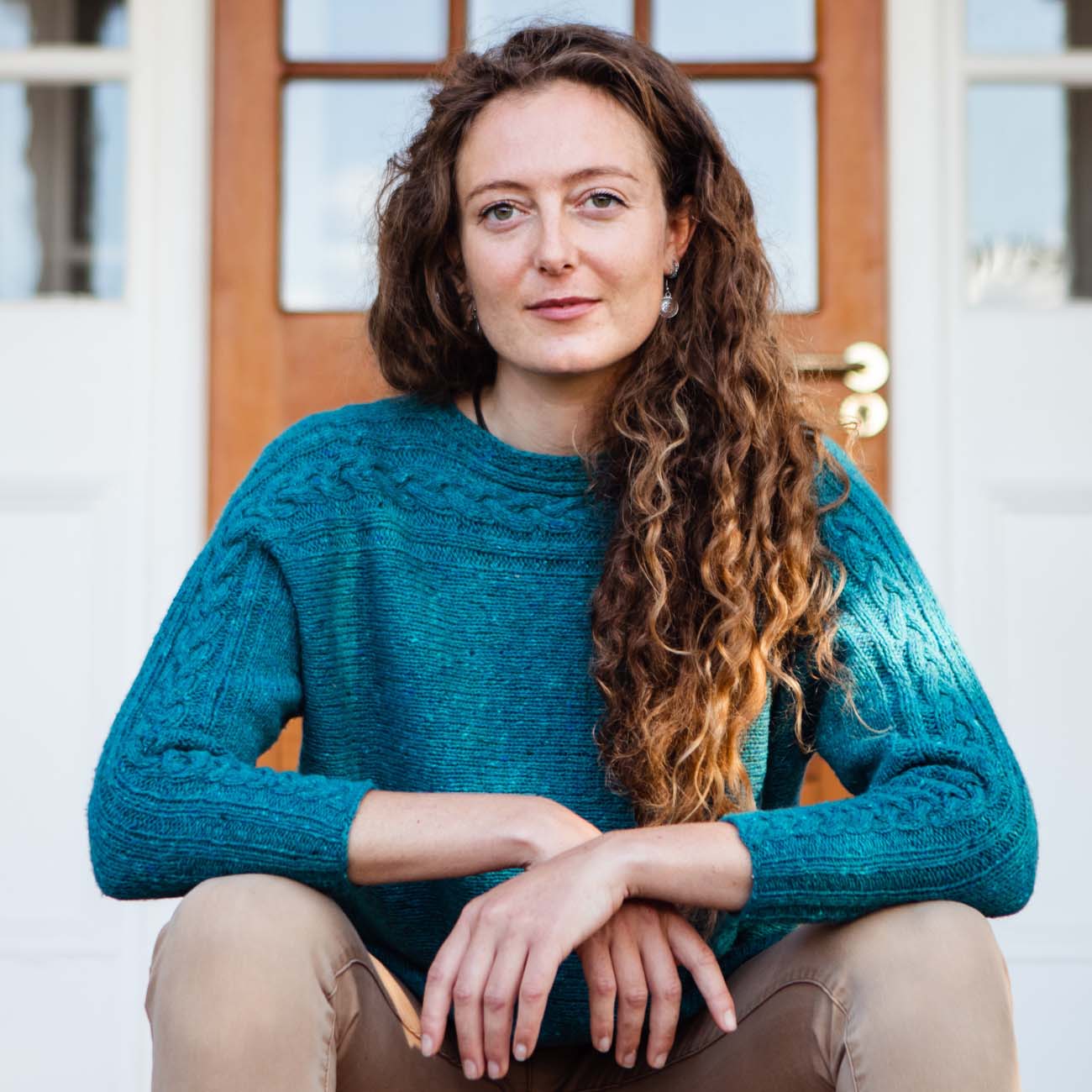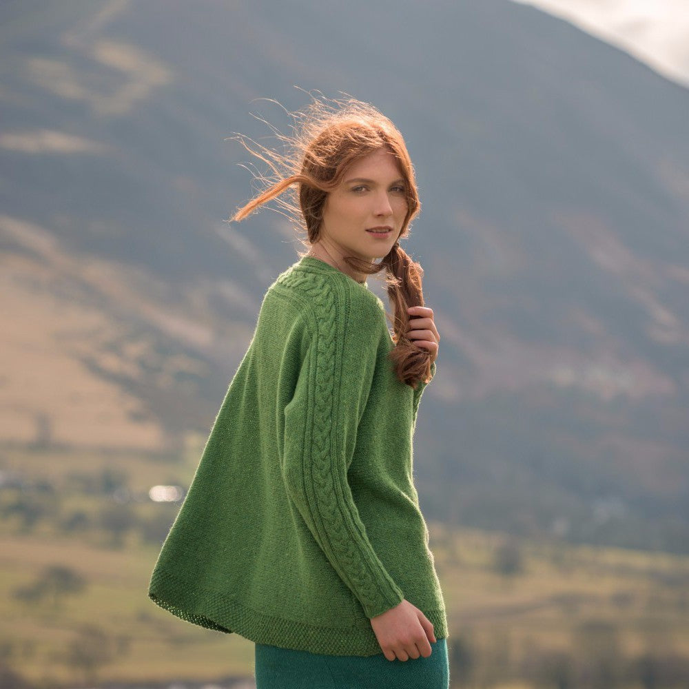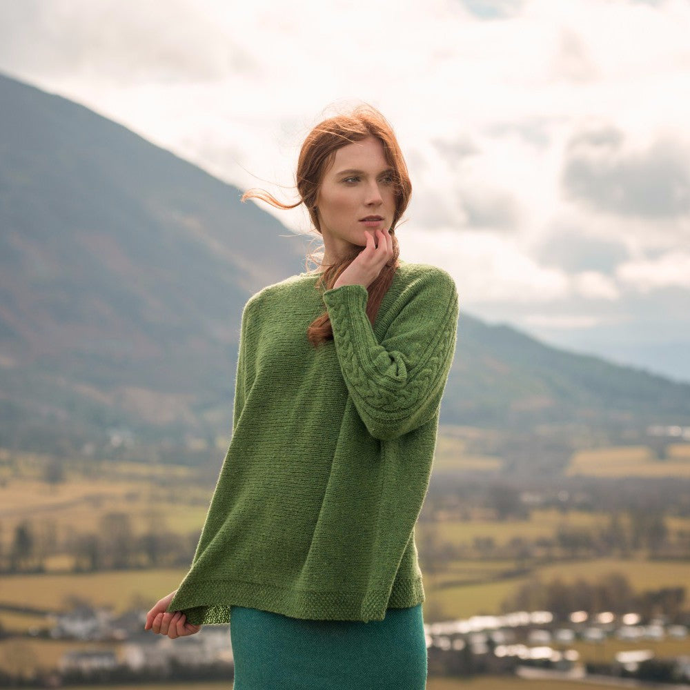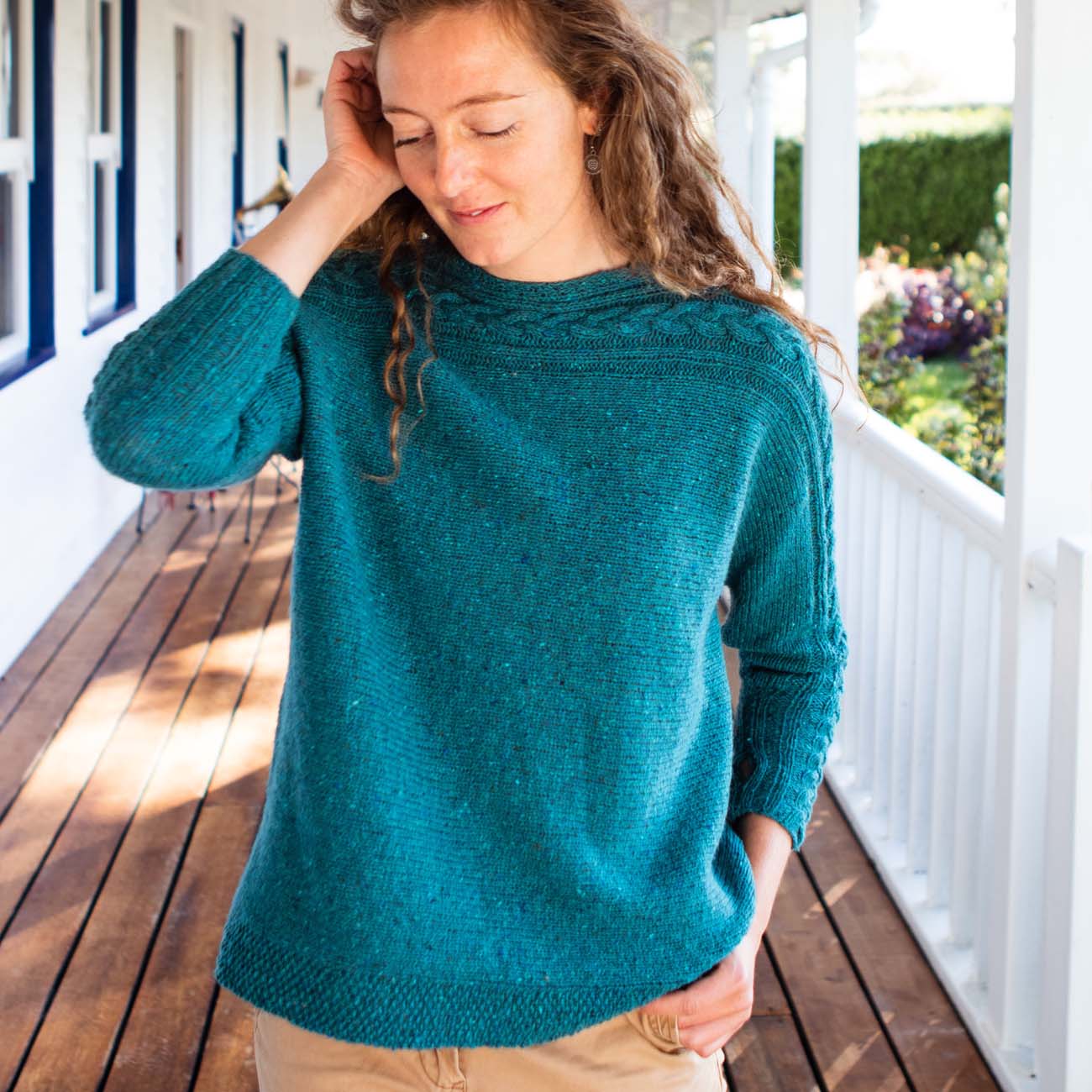 Designer Kari-Helene Rane created this beautiful boxy sweater, which features a striking cable design along the sleeves and neck that can be worn on the front or back. It is worked flat in one piece from cuff to cuff and seamed. Knit in Arranmore Light, the sweater is cozy and warm.