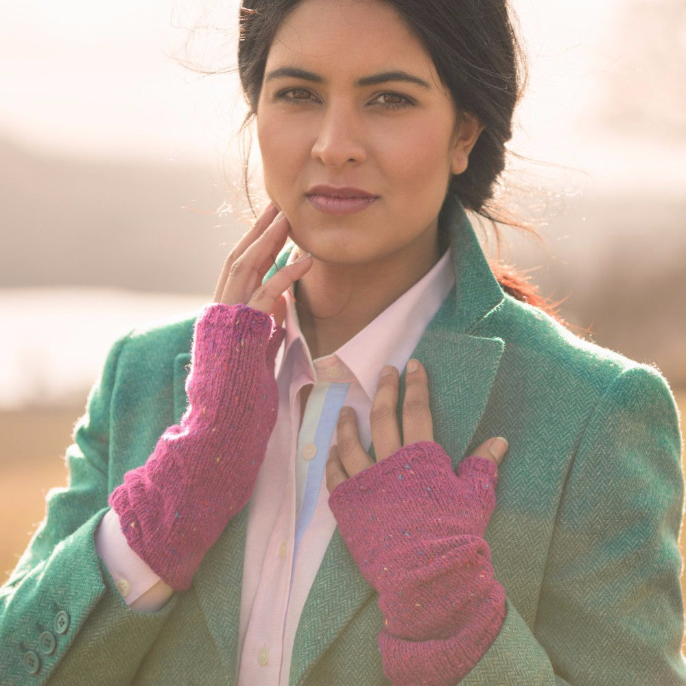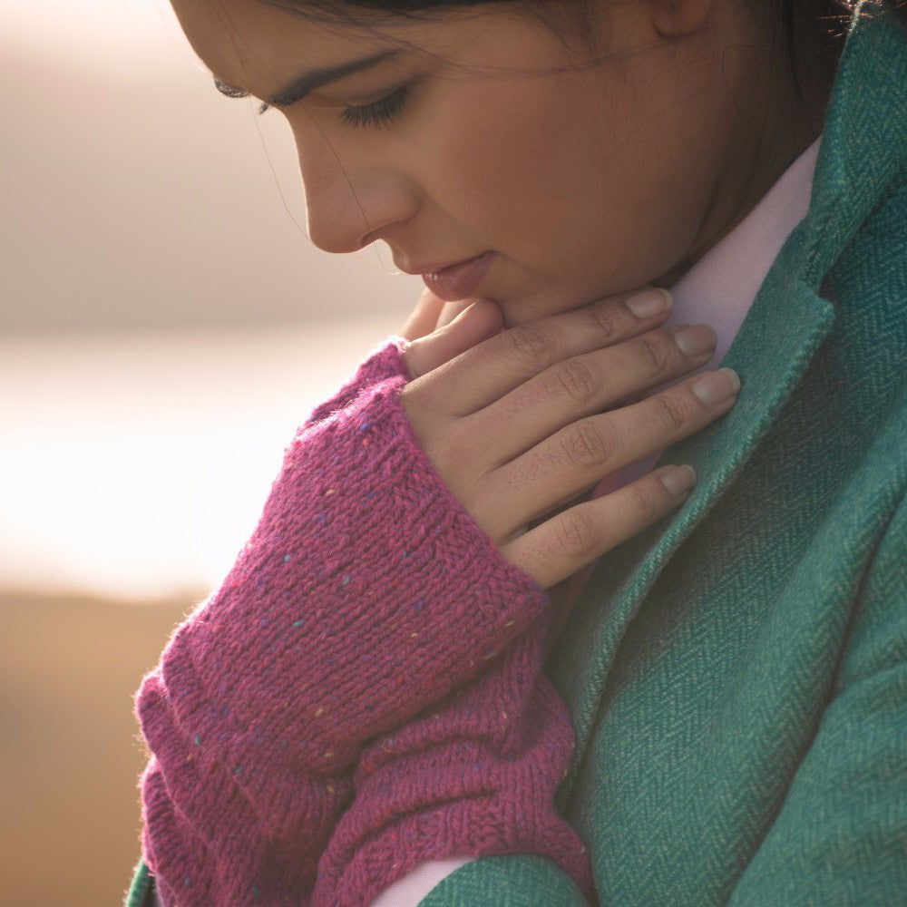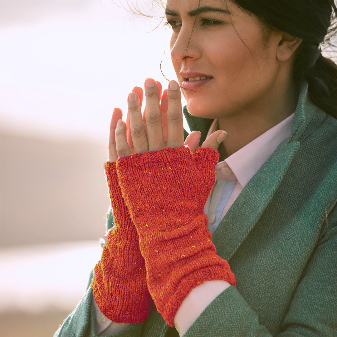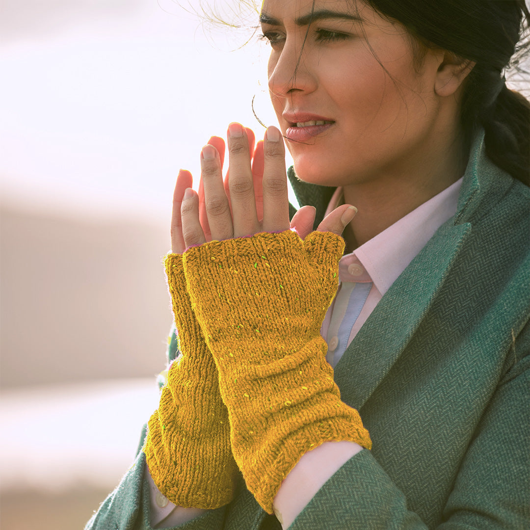 These fingerless mitts designed by Emma Welford, are worked in the round in one piece. Tucks are knitted into the piece as it is worked.