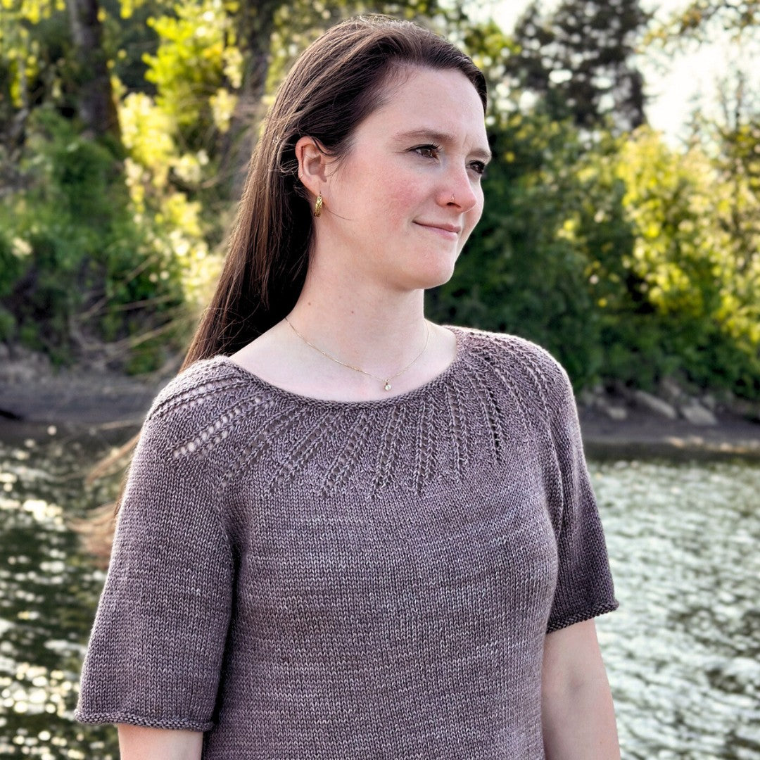 Designed by Kay Hopkins, the Starburst Tee features a stunning yet deceptively simple lace motif that radiates from a wide neckline. The hybrid yoke construction begins with a circular yoke—perfect for effortless lacework—and subtly transitions to raglan shaping for a flattering fit. Worked top-down and in the round, this seamless design offers a polished finish with minimal effort, while clever short row shaping refines the fit around the neck. Optional shaping for an angled hemline allows you to add a bit of length in the back, which is flattering on many figure types and makes for comfortable wearing. Perfect over linen skirts, casual denim, or layered under your favorite cardigan, this tee offers timeless versatility and effortless charm.