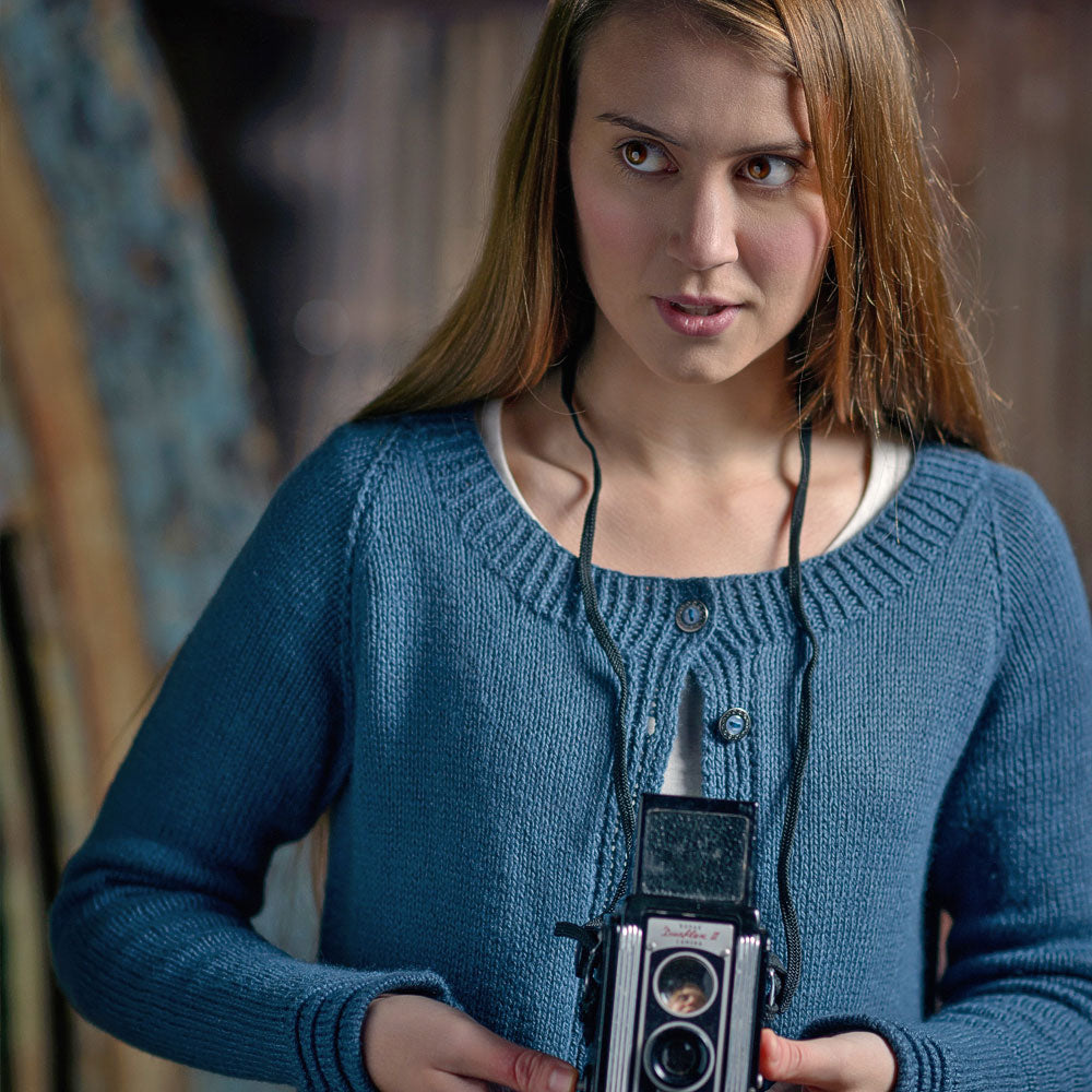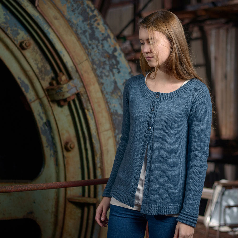 Worked from the bottom up in pieces and seamed for stability, this cardigan is a classic raglan that helps you understand structure in garments to create flattering, well-fitted shapes. This beautiful cardigan has tuck stitch details on the cuff, a rounded neckline, and a sewn-in button band.