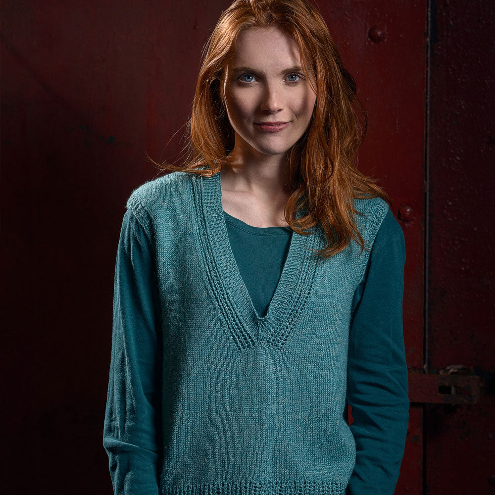 This elegant V-neck Sleeveless Top, knit in The Fibre Co. Meadow, features a deep V-neck and a timeless silhouette enhanced by subtle waist shaping for a flattering fit. Delicate eyelet edging finishes the armholes, while a clean ribbed neckband adds structure to the neckline. Lightweight and effortlessly wearable, it combines classic style with refined, modern details.