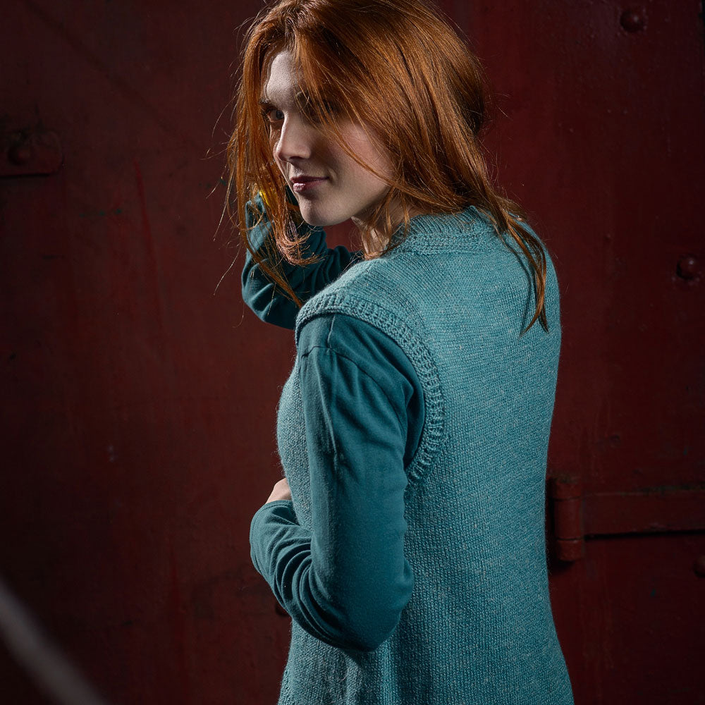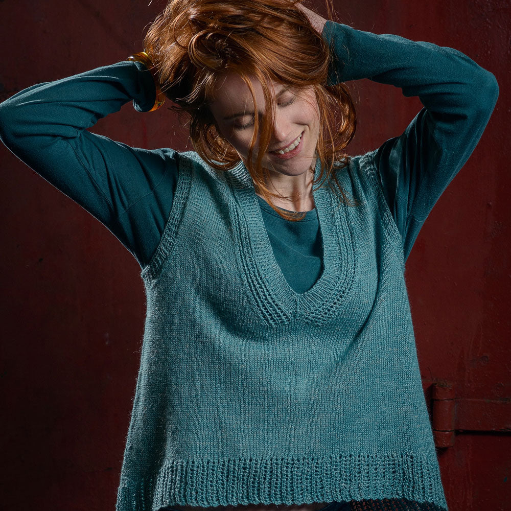 This elegant V-neck Sleeveless Top, knit in The Fibre Co. Meadow, features a deep V-neck and a timeless silhouette enhanced by subtle waist shaping for a flattering fit. Delicate eyelet edging finishes the armholes, while a clean ribbed neckband adds structure to the neckline. Lightweight and effortlessly wearable, it combines...