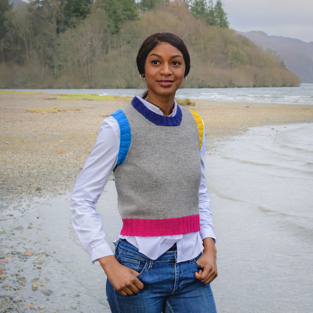 VestFlex is a versatile, cropped sweater vest with a modern silhouette. Ribbing at the crew neck, armholes, and hem adds subtle texture and a polished finish.