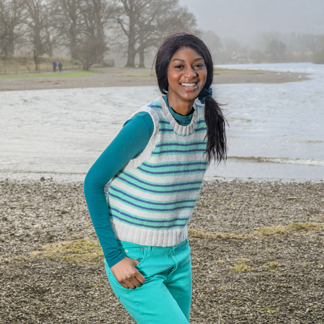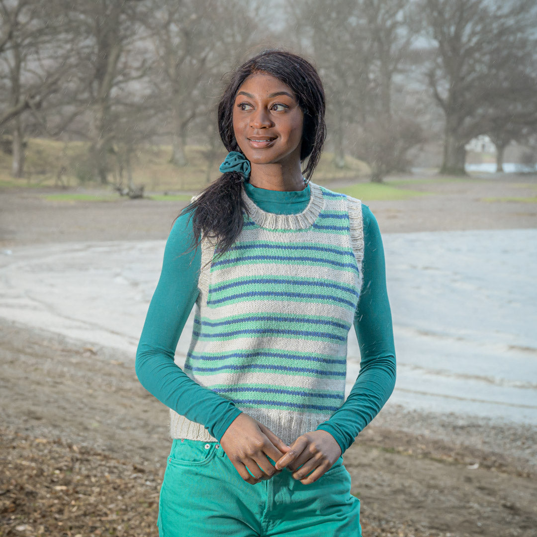 Striped Version: Betty White – 2 balls, Spearmint – 1 ball, and Prince – 1 ball. (Size 2: to fit chest circumference 34–36 in)