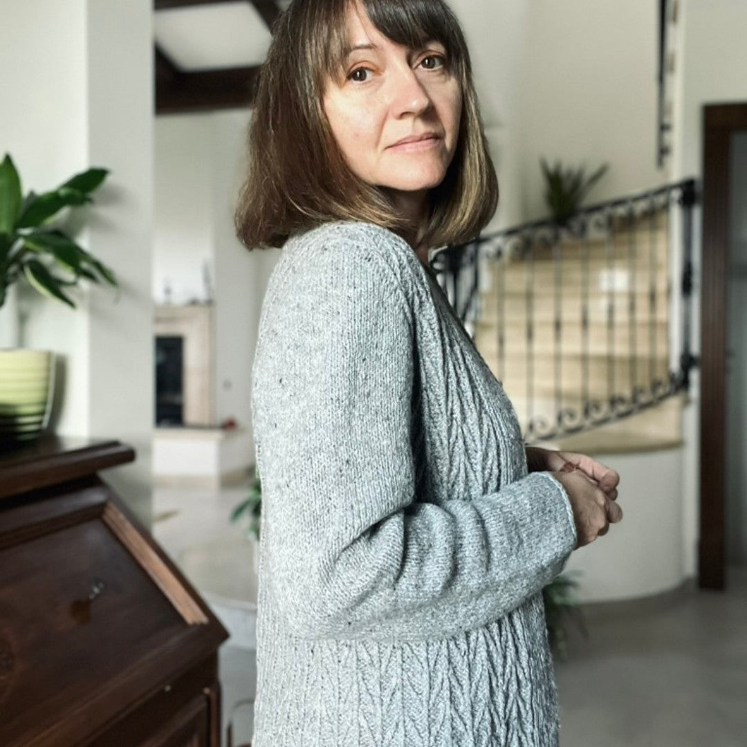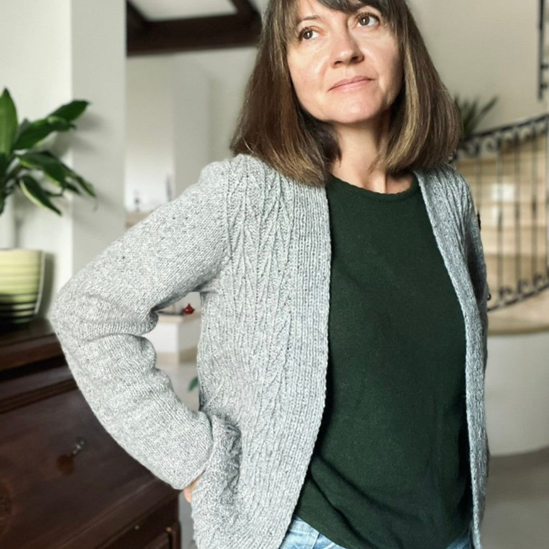The Zhuzi cardigan features a modern and minimalist silhouette and a delicate stitch pattern reminiscent of bamboo leaves—Zhuzi meaning “bamboo” in Mandarin. Designed by Stella Egidi, this top-down cardigan is worked flat with set-in sleeves. The construction begins with a sideways provisional cast-on for the back neckline, which then joins the front and back at the underarm. Stitches are picked up along the neckline and shoulders, creating a seamless, flowing fit. The I-cord bind-off along the bottom and sleeves adds a crisp, polished finish. This versatile wardrobe piece can be dressed up or down for year-round wear, where both comfort and style are appreciated.