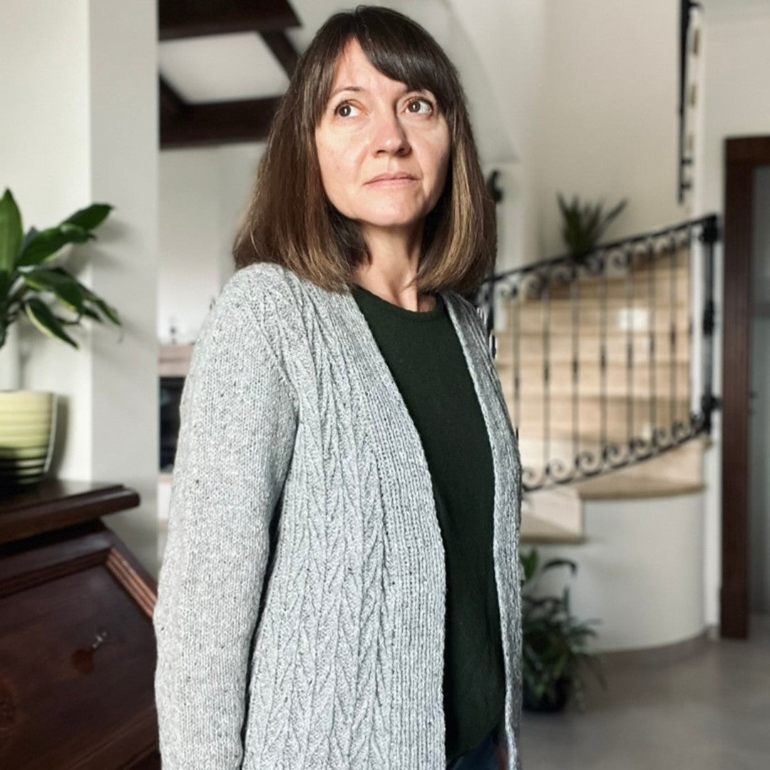 Designed with 5–10 cm (2–4 in) of positive ease at chest circumference. Photographs show the cardigan knit in Size 2 with approximately 7.5 cm (3 in) of positive ease.